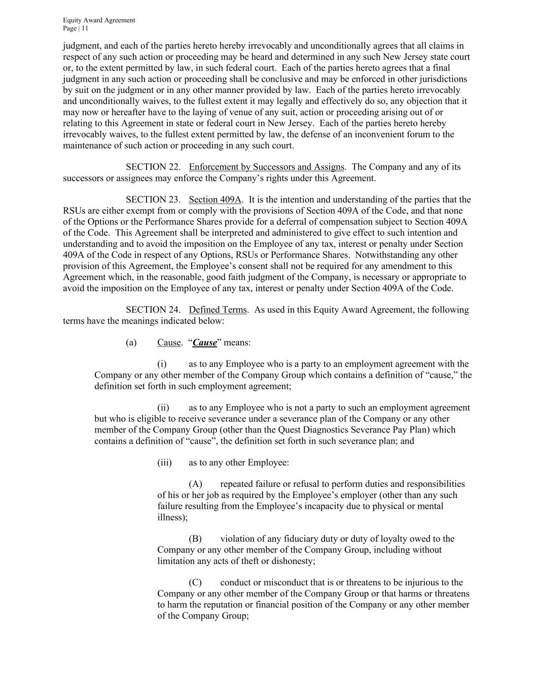 Equity Award Agreement Page | 11 judgment, and each of the parties hereto hereby irrevocably and unconditionally agrees that all claims in respect of any such action or proceeding may be heard and determined in any such New Jersey state court or, to the extent permitted by law, in such federal court. Each of the parties hereto agrees that a final judgment in any such action or proceeding shall be conclusive and may be enforced in other jurisdictions by suit on the judgment or in any other manner provided by law. Each of the parties hereto irrevocably and unconditionally waives, to the fullest extent it may legally and effectively do so, any objection that it may now or hereafter have to the laying of venue of any suit, action or proceeding arising out of or relating to this Agreement in state or federal court in New Jersey. Each of the parties hereto hereby irrevocably waives, to the fullest extent permitted by law, the defense of an inconvenient forum to the maintenance of such action or proceeding in any such court. SECTION 22. Enforcement by Successors and Assigns. The Company and any of its successors or assignees may enforce the Company’s rights under this Agreement. SECTION 23. Section 409A. It is the intention and understanding of the parties that the RSUs are either exempt from or comply with the provisions of Section 409A of the Code, and that none of the Options or the Performance Shares provide for a deferral of compensation subject to Section 409A of the Code. This Agreement shall be interpreted and administered to give effect to such intention and understanding and to avoid the imposition on the Employee of any tax, interest or penalty under Section 409A of the Code in respect of any Options, RSUs or Performance Shares. Notwithstanding any other provision of this Agreement, the Employee’s consent shall not be required for any amendment to this Agreement which, in the reasonable, good faith judgment of the Company, is necessary or appropriate to avoid the imposition on the Employee of any tax, interest or penalty under Section 409A of the Code. SECTION 24. Defined Terms. As used in this Equity Award Agreement, the following terms have the meanings indicated below: (a) Cause. “Cause” means: (i) as to any Employee who is a party to an employment agreement with the Company or any other member of the Company Group which contains a definition of “cause,” the definition set forth in such employment agreement; (ii) as to any Employee who is not a party to such an employment agreement but who is eligible to receive severance under a severance plan of the Company or any other member of the Company Group (other than the Quest Diagnostics Severance Pay Plan) which contains a definition of “cause”, the definition set forth in such severance plan; and (iii) as to any other Employee: (A) repeated failure or refusal to perform duties and responsibilities of his or her job as required by the Employee’s employer (other than any such failure resulting from the Employee’s incapacity due to physical or mental illness); (B) violation of any fiduciary duty or duty of loyalty owed to the Company or any other member of the Company Group, including without limitation any acts of theft or dishonesty; (C) conduct or misconduct that is or threatens to be injurious to the Company or any other member of the Company Group or that harms or threatens to harm the reputation or financial position of the Company or any other member of the Company Group;