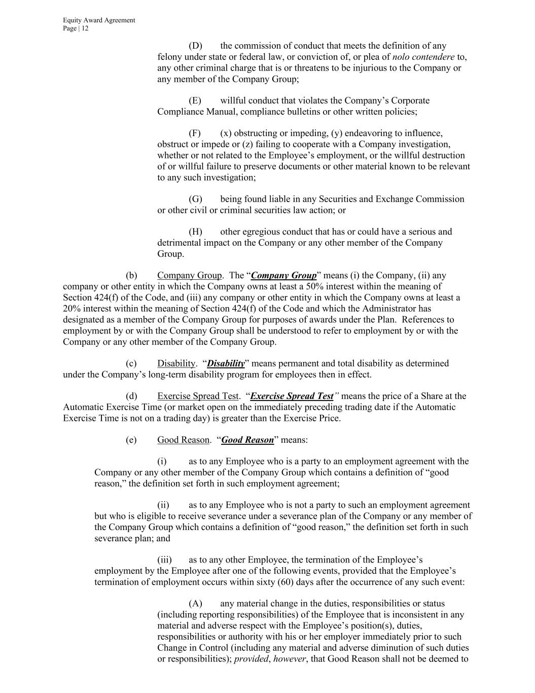 Equity Award Agreement Page | 12 (D) the commission of conduct that meets the definition of any felony under state or federal law, or conviction of, or plea of nolo contendere to, any other criminal charge that is or threatens to be injurious to the Company or any member of the Company Group; (E) willful conduct that violates the Company’s Corporate Compliance Manual, compliance bulletins or other written policies; (F) (x) obstructing or impeding, (y) endeavoring to influence, obstruct or impede or (z) failing to cooperate with a Company investigation, whether or not related to the Employee’s employment, or the willful destruction of or willful failure to preserve documents or other material known to be relevant to any such investigation; (G) being found liable in any Securities and Exchange Commission or other civil or criminal securities law action; or (H) other egregious conduct that has or could have a serious and detrimental impact on the Company or any other member of the Company Group. (b) Company Group. The “Company Group” means (i) the Company, (ii) any company or other entity in which the Company owns at least a 50% interest within the meaning of Section 424(f) of the Code, and (iii) any company or other entity in which the Company owns at least a 20% interest within the meaning of Section 424(f) of the Code and which the Administrator has designated as a member of the Company Group for purposes of awards under the Plan. References to employment by or with the Company Group shall be understood to refer to employment by or with the Company or any other member of the Company Group. (c) Disability. “Disability” means permanent and total disability as determined under the Company’s long-term disability program for employees then in effect. (d) Exercise Spread Test. “Exercise Spread Test” means the price of a Share at the Automatic Exercise Time (or market open on the immediately preceding trading date if the Automatic Exercise Time is not on a trading day) is greater than the Exercise Price. (e) Good Reason. “Good Reason” means: (i) as to any Employee who is a party to an employment agreement with the Company or any other member of the Company Group which contains a definition of “good reason,” the definition set forth in such employment agreement; (ii) as to any Employee who is not a party to such an employment agreement but who is eligible to receive severance under a severance plan of the Company or any member of the Company Group which contains a definition of “good reason,” the definition set forth in such severance plan; and (iii) as to any other Employee, the termination of the Employee’s employment by the Employee after one of the following events, provided that the Employee’s termination of employment occurs within sixty (60) days after the occurrence of any such event: (A) any material change in the duties, responsibilities or status (including reporting responsibilities) of the Employee that is inconsistent in any material and adverse respect with the Employee’s position(s), duties, responsibilities or authority with his or her employer immediately prior to such Change in Control (including any material and adverse diminution of such duties or responsibilities); provided, however, that Good Reason shall not be deemed to