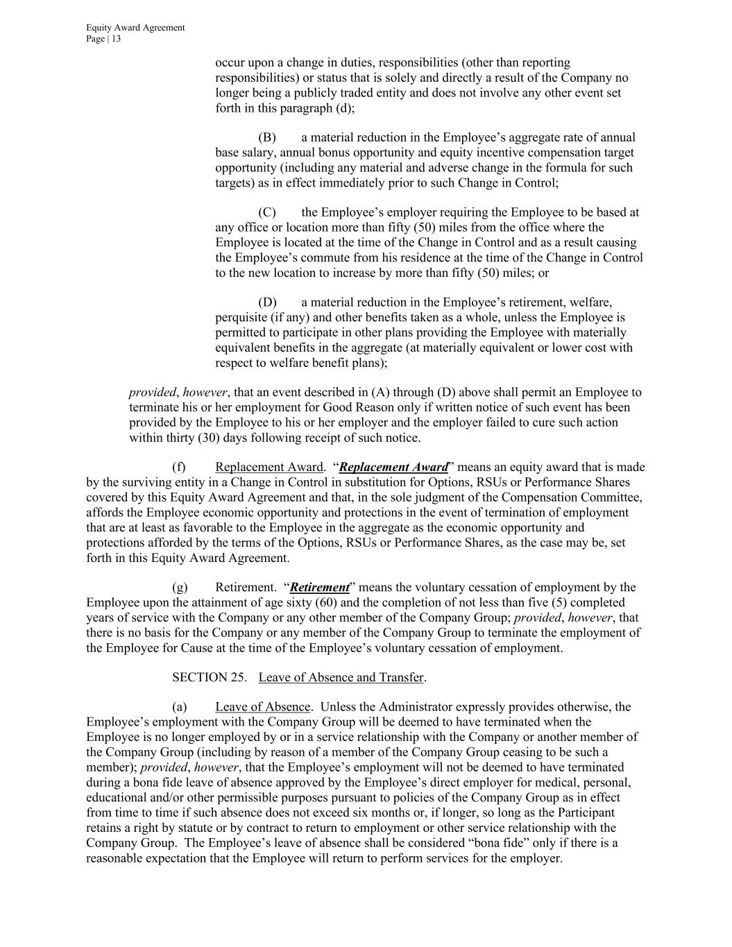 Equity Award Agreement Page | 13 occur upon a change in duties, responsibilities (other than reporting responsibilities) or status that is solely and directly a result of the Company no longer being a publicly traded entity and does not involve any other event set forth in this paragraph (d); (B) a material reduction in the Employee’s aggregate rate of annual base salary, annual bonus opportunity and equity incentive compensation target opportunity (including any material and adverse change in the formula for such targets) as in effect immediately prior to such Change in Control; (C) the Employee’s employer requiring the Employee to be based at any office or location more than fifty (50) miles from the office where the Employee is located at the time of the Change in Control and as a result causing the Employee’s commute from his residence at the time of the Change in Control to the new location to increase by more than fifty (50) miles; or (D) a material reduction in the Employee’s retirement, welfare, perquisite (if any) and other benefits taken as a whole, unless the Employee is permitted to participate in other plans providing the Employee with materially equivalent benefits in the aggregate (at materially equivalent or lower cost with respect to welfare benefit plans); provided, however, that an event described in (A) through (D) above shall permit an Employee to terminate his or her employment for Good Reason only if written notice of such event has been provided by the Employee to his or her employer and the employer failed to cure such action within thirty (30) days following receipt of such notice. (f) Replacement Award. “Replacement Award” means an equity award that is made by the surviving entity in a Change in Control in substitution for Options, RSUs or Performance Shares covered by this Equity Award Agreement and that, in the sole judgment of the Compensation Committee, affords the Employee economic opportunity and protections in the event of termination of employment that are at least as favorable to the Employee in the aggregate as the economic opportunity and protections afforded by the terms of the Options, RSUs or Performance Shares, as the case may be, set forth in this Equity Award Agreement. (g) Retirement. “Retirement” means the voluntary cessation of employment by the Employee upon the attainment of age sixty (60) and the completion of not less than five (5) completed years of service with the Company or any other member of the Company Group; provided, however, that there is no basis for the Company or any member of the Company Group to terminate the employment of the Employee for Cause at the time of the Employee’s voluntary cessation of employment. SECTION 25. Leave of Absence and Transfer. (a) Leave of Absence. Unless the Administrator expressly provides otherwise, the Employee’s employment with the Company Group will be deemed to have terminated when the Employee is no longer employed by or in a service relationship with the Company or another member of the Company Group (including by reason of a member of the Company Group ceasing to be such a member); provided, however, that the Employee’s employment will not be deemed to have terminated during a bona fide leave of absence approved by the Employee’s direct employer for medical, personal, educational and/or other permissible purposes pursuant to policies of the Company Group as in effect from time to time if such absence does not exceed six months or, if longer, so long as the Participant retains a right by statute or by contract to return to employment or other service relationship with the Company Group. The Employee’s leave of absence shall be considered “bona fide” only if there is a reasonable expectation that the Employee will return to perform services for the employer.