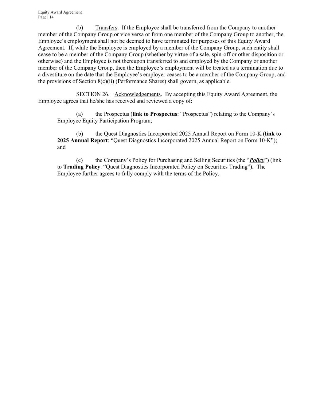 Equity Award Agreement Page | 14 (b) Transfers. If the Employee shall be transferred from the Company to another member of the Company Group or vice versa or from one member of the Company Group to another, the Employee’s employment shall not be deemed to have terminated for purposes of this Equity Award Agreement. If, while the Employee is employed by a member of the Company Group, such entity shall cease to be a member of the Company Group (whether by virtue of a sale, spin-off or other disposition or otherwise) and the Employee is not thereupon transferred to and employed by the Company or another member of the Company Group, then the Employee’s employment will be treated as a termination due to a divestiture on the date that the Employee’s employer ceases to be a member of the Company Group, and the provisions of Section 8(c)(ii) (Performance Shares) shall govern, as applicable. SECTION 26. Acknowledgements. By accepting this Equity Award Agreement, the Employee agrees that he/she has received and reviewed a copy of: (a) the Prospectus (link to Prospectus: “Prospectus”) relating to the Company’s Employee Equity Participation Program; (b) the Quest Diagnostics Incorporated 2025 Annual Report on Form 10-K (link to 2025 Annual Report: “Quest Diagnostics Incorporated 2025 Annual Report on Form 10-K”); and (c) the Company’s Policy for Purchasing and Selling Securities (the “Policy”) (link to Trading Policy: “Quest Diagnostics Incorporated Policy on Securities Trading”). The Employee further agrees to fully comply with the terms of the Policy.