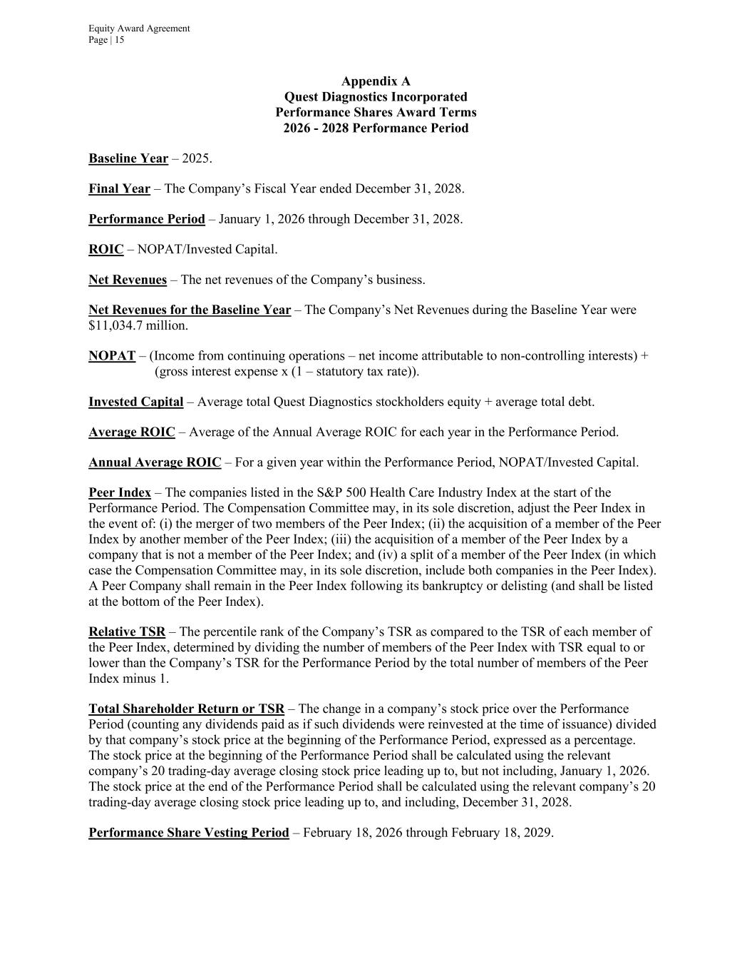 Equity Award Agreement Page | 15 Appendix A Quest Diagnostics Incorporated Performance Shares Award Terms 2026 - 2028 Performance Period Baseline Year – 2025. Final Year – The Company’s Fiscal Year ended December 31, 2028. Performance Period – January 1, 2026 through December 31, 2028. ROIC – NOPAT/Invested Capital. Net Revenues – The net revenues of the Company’s business. Net Revenues for the Baseline Year – The Company’s Net Revenues during the Baseline Year were $11,034.7 million. NOPAT – (Income from continuing operations – net income attributable to non-controlling interests) + (gross interest expense x (1 – statutory tax rate)). Invested Capital – Average total Quest Diagnostics stockholders equity + average total debt. Average ROIC – Average of the Annual Average ROIC for each year in the Performance Period. Annual Average ROIC – For a given year within the Performance Period, NOPAT/Invested Capital. Peer Index – The companies listed in the S&P 500 Health Care Industry Index at the start of the Performance Period. The Compensation Committee may, in its sole discretion, adjust the Peer Index in the event of: (i) the merger of two members of the Peer Index; (ii) the acquisition of a member of the Peer Index by another member of the Peer Index; (iii) the acquisition of a member of the Peer Index by a company that is not a member of the Peer Index; and (iv) a split of a member of the Peer Index (in which case the Compensation Committee may, in its sole discretion, include both companies in the Peer Index). A Peer Company shall remain in the Peer Index following its bankruptcy or delisting (and shall be listed at the bottom of the Peer Index). Relative TSR – The percentile rank of the Company’s TSR as compared to the TSR of each member of the Peer Index, determined by dividing the number of members of the Peer Index with TSR equal to or lower than the Company’s TSR for the Performance Period by the total number of members of the Peer Index minus 1. Total Shareholder Return or TSR – The change in a company’s stock price over the Performance Period (counting any dividends paid as if such dividends were reinvested at the time of issuance) divided by that company’s stock price at the beginning of the Performance Period, expressed as a percentage. The stock price at the beginning of the Performance Period shall be calculated using the relevant company’s 20 trading-day average closing stock price leading up to, but not including, January 1, 2026. The stock price at the end of the Performance Period shall be calculated using the relevant company’s 20 trading-day average closing stock price leading up to, and including, December 31, 2028. Performance Share Vesting Period – February 18, 2026 through February 18, 2029.