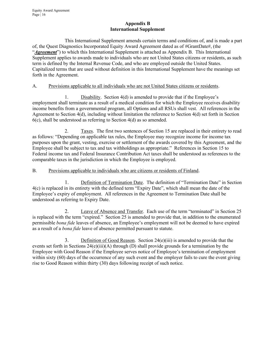 Equity Award Agreement Page | 16 Appendix B International Supplement This International Supplement amends certain terms and conditions of, and is made a part of, the Quest Diagnostics Incorporated Equity Award Agreement dated as of #GrantDate#, (the “Agreement”) to which this International Supplement is attached as Appendix B. This International Supplement applies to awards made to individuals who are not United States citizens or residents, as such term is defined by the Internal Revenue Code, and who are employed outside the United States. Capitalized terms that are used without definition in this International Supplement have the meanings set forth in the Agreement. A. Provisions applicable to all individuals who are not United States citizens or residents. 1. Disability. Section 4(d) is amended to provide that if the Employee’s employment shall terminate as a result of a medical condition for which the Employee receives disability income benefits from a governmental program, all Options and all RSUs shall vest. All references in the Agreement to Section 4(d), including without limitation the reference to Section 4(d) set forth in Section 6(c), shall be understood as referring to Section 4(d) as so amended. 2. Taxes. The first two sentences of Section 15 are replaced in their entirety to read as follows: “Depending on applicable tax rules, the Employee may recognize income for income tax purposes upon the grant, vesting, exercise or settlement of the awards covered by this Agreement, and the Employee shall be subject to tax and tax withholdings as appropriate.” References in Section 15 to Federal income tax and Federal Insurance Contribution Act taxes shall be understood as references to the comparable taxes in the jurisdiction in which the Employee is employed. B. Provisions applicable to individuals who are citizens or residents of Finland. 1. Definition of Termination Date. The definition of “Termination Date” in Section 4(c) is replaced in its entirety with the defined term “Expiry Date”, which shall mean the date of the Employee’s expiry of employment. All references in the Agreement to Termination Date shall be understood as referring to Expiry Date. 2. Leave of Absence and Transfer. Each use of the term “terminated” in Section 25 is replaced with the term “expired.” Section 25 is amended to provide that, in addition to the enumerated permissible bona fide leaves of absence, an Employee’s employment will not be deemed to have expired as a result of a bona fide leave of absence permitted pursuant to statute. 3. Definition of Good Reason. Section 24(e)(iii) is amended to provide that the events set forth in Sections 24(e)(iii)(A) through (D) shall provide grounds for a termination by the Employee with Good Reason if the Employee serves notice of Employee’s termination of employment within sixty (60) days of the occurrence of any such event and the employer fails to cure the event giving rise to Good Reason within thirty (30) days following receipt of such notice.
