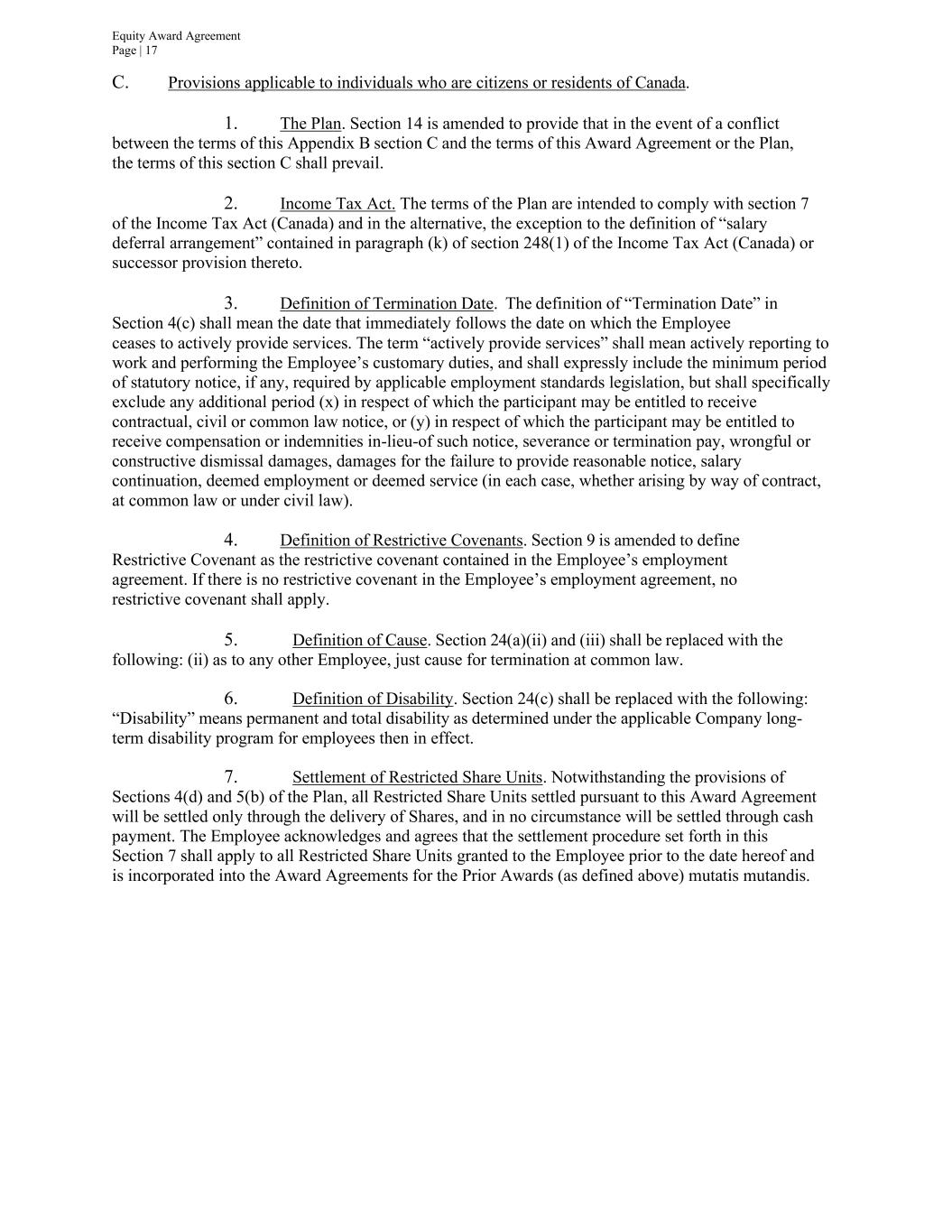 Equity Award Agreement Page | 17 C. Provisions applicable to individuals who are citizens or residents of Canada. 1. The Plan. Section 14 is amended to provide that in the event of a conflict between the terms of this Appendix B section C and the terms of this Award Agreement or the Plan, the terms of this section C shall prevail. 2. Income Tax Act. The terms of the Plan are intended to comply with section 7 of the Income Tax Act (Canada) and in the alternative, the exception to the definition of “salary deferral arrangement” contained in paragraph (k) of section 248(1) of the Income Tax Act (Canada) or successor provision thereto. 3. Definition of Termination Date. The definition of “Termination Date” in Section 4(c) shall mean the date that immediately follows the date on which the Employee ceases to actively provide services. The term “actively provide services” shall mean actively reporting to work and performing the Employee’s customary duties, and shall expressly include the minimum period of statutory notice, if any, required by applicable employment standards legislation, but shall specifically exclude any additional period (x) in respect of which the participant may be entitled to receive contractual, civil or common law notice, or (y) in respect of which the participant may be entitled to receive compensation or indemnities in-lieu-of such notice, severance or termination pay, wrongful or constructive dismissal damages, damages for the failure to provide reasonable notice, salary continuation, deemed employment or deemed service (in each case, whether arising by way of contract, at common law or under civil law). 4. Definition of Restrictive Covenants. Section 9 is amended to define Restrictive Covenant as the restrictive covenant contained in the Employee’s employment agreement. If there is no restrictive covenant in the Employee’s employment agreement, no restrictive covenant shall apply. 5. Definition of Cause. Section 24(a)(ii) and (iii) shall be replaced with the following: (ii) as to any other Employee, just cause for termination at common law. 6. Definition of Disability. Section 24(c) shall be replaced with the following: “Disability” means permanent and total disability as determined under the applicable Company long- term disability program for employees then in effect. 7. Settlement of Restricted Share Units. Notwithstanding the provisions of Sections 4(d) and 5(b) of the Plan, all Restricted Share Units settled pursuant to this Award Agreement will be settled only through the delivery of Shares, and in no circumstance will be settled through cash payment. The Employee acknowledges and agrees that the settlement procedure set forth in this Section 7 shall apply to all Restricted Share Units granted to the Employee prior to the date hereof and is incorporated into the Award Agreements for the Prior Awards (as defined above) mutatis mutandis.