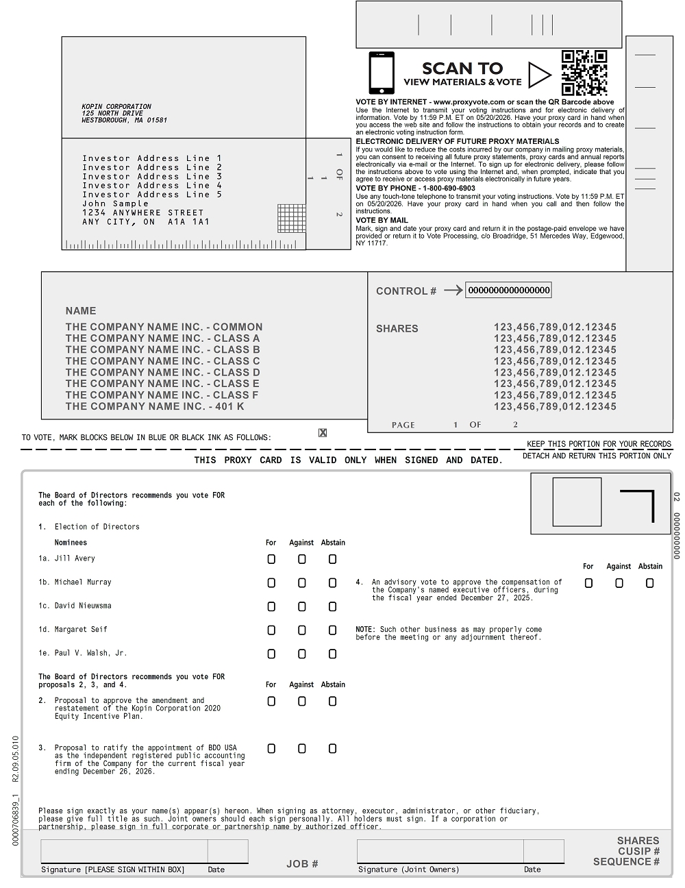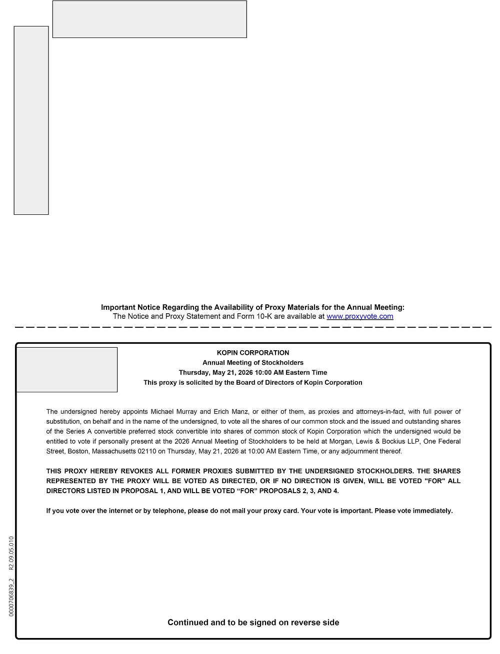 Important Notice Regarding Internet Availability of Proxy Materials for the Stockholders Meeting to be Held at the Offices of Morgan, Lewis & Bockius LLP, One Federal Street, Boston, Massachusetts 02110 on Thursday, May 21, 2026, at 10:00 a.m. Eastern Time. The Proxy Statement and our 2025 Annual Report to Stockholders are also available on our website at www.kopin.com/proxy.