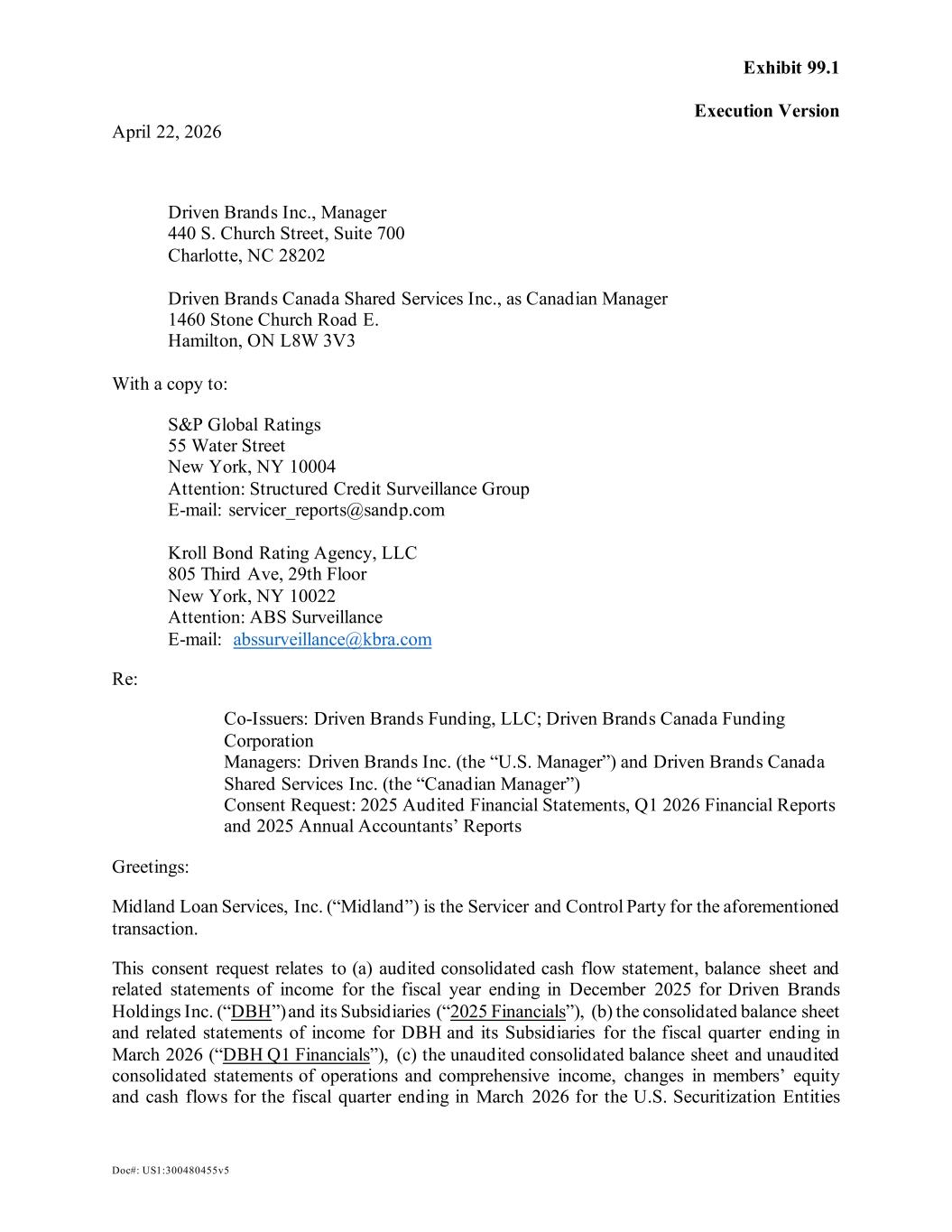 Exhibit 99.1 Execution Version Doc#: US1:300480455v5 April 22, 2026 Driven Brands Inc., Manager 440 S. Church Street, Suite 700 Charlotte, NC 28202 Driven Brands Canada Shared Services Inc., as Canadian Manager 1460 Stone Church Road E. Hamilton, ON L8W 3V3 With a copy to: S&P Global Ratings 55 Water Street New York, NY 10004 Attention: Structured Credit Surveillance Group E-mail: servicer_reports@sandp.com Kroll Bond Rating Agency, LLC 805 Third Ave, 29th Floor New York, NY 10022 Attention: ABS Surveillance E-mail: abssurveillance@kbra.com Re: Co-Issuers: Driven Brands Funding, LLC; Driven Brands Canada Funding Corporation Managers: Driven Brands Inc. (the “U.S. Manager”) and Driven Brands Canada Shared Services Inc. (the “Canadian Manager”) Consent Request: 2025 Audited Financial Statements, Q1 2026 Financial Reports and 2025 Annual Accountants’ Reports Greetings: Midland Loan Services, Inc. (“Midland”) is the Servicer and Control Party for the aforementioned transaction. This consent request relates to (a) audited consolidated cash flow statement, balance sheet and related statements of income for the fiscal year ending in December 2025 for Driven Brands Holdings Inc. (“DBH”) and its Subsidiaries (“2025 Financials”), (b) the consolidated balance sheet and related statements of income for DBH and its Subsidiaries for the fiscal quarter ending in March 2026 (“DBH Q1 Financials”), (c) the unaudited consolidated balance sheet and unaudited consolidated statements of operations and comprehensive income, changes in members’ equity and cash flows for the fiscal quarter ending in March 2026 for the U.S. Securitization Entities