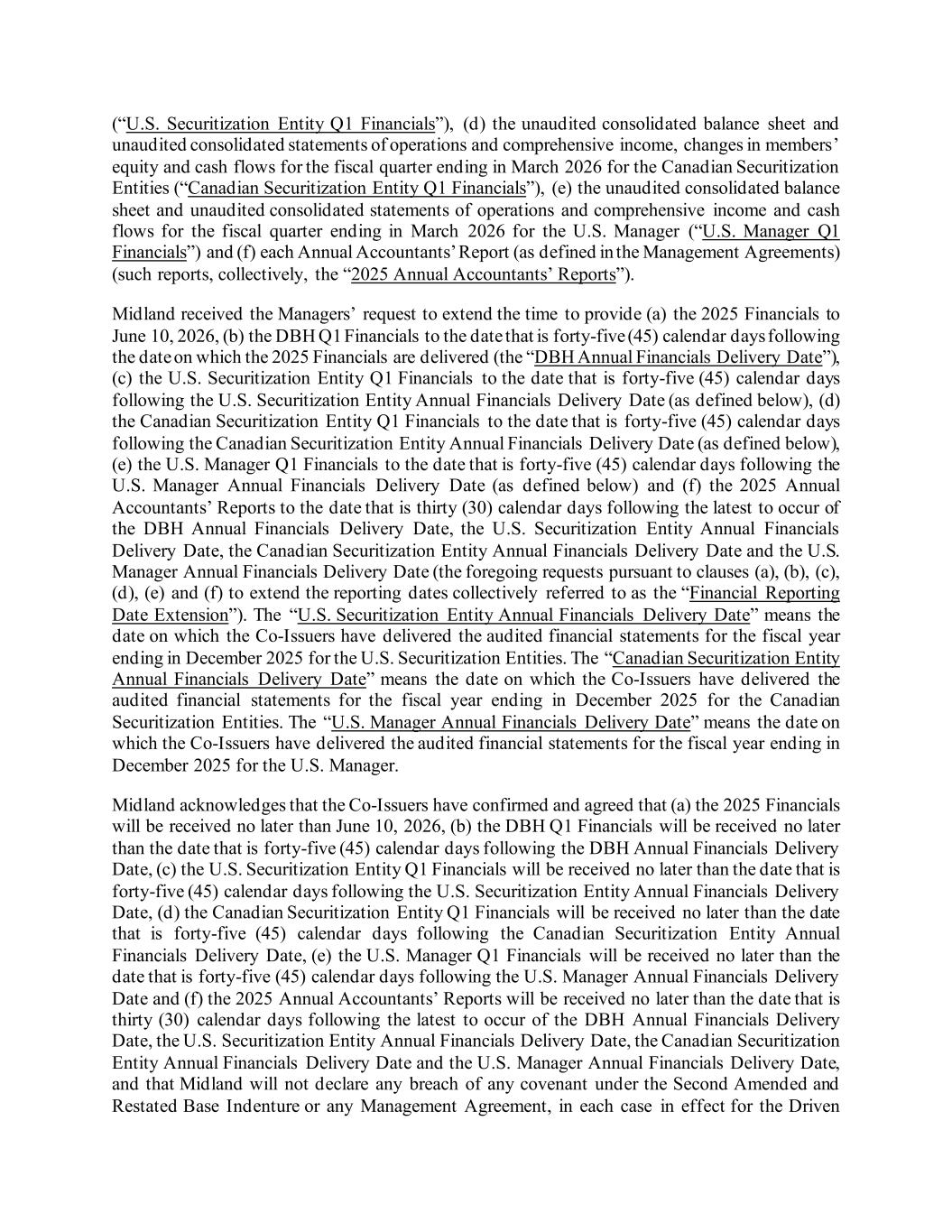 (“U.S. Securitization Entity Q1 Financials”), (d) the unaudited consolidated balance sheet and unaudited consolidated statements of operations and comprehensive income, changes in members’ equity and cash flows for the fiscal quarter ending in March 2026 for the Canadian Securitization Entities (“Canadian Securitization Entity Q1 Financials”), (e) the unaudited consolidated balance sheet and unaudited consolidated statements of operations and comprehensive income and cash flows for the fiscal quarter ending in March 2026 for the U.S. Manager (“U.S. Manager Q1 Financials”) and (f) each Annual Accountants’ Report (as defined in the Management Agreements) (such reports, collectively, the “2025 Annual Accountants’ Reports”). Midland received the Managers’ request to extend the time to provide (a) the 2025 Financials to June 10, 2026, (b) the DBH Q1 Financials to the date that is forty-five (45) calendar days following the date on which the 2025 Financials are delivered (the “DBH Annual Financials Delivery Date”), (c) the U.S. Securitization Entity Q1 Financials to the date that is forty-five (45) calendar days following the U.S. Securitization Entity Annual Financials Delivery Date (as defined below), (d) the Canadian Securitization Entity Q1 Financials to the date that is forty-five (45) calendar days following the Canadian Securitization Entity Annual Financials Delivery Date (as defined below), (e) the U.S. Manager Q1 Financials to the date that is forty-five (45) calendar days following the U.S. Manager Annual Financials Delivery Date (as defined below) and (f) the 2025 Annual Accountants’ Reports to the date that is thirty (30) calendar days following the latest to occur of the DBH Annual Financials Delivery Date, the U.S. Securitization Entity Annual Financials Delivery Date, the Canadian Securitization Entity Annual Financials Delivery Date and the U.S. Manager Annual Financials Delivery Date (the foregoing requests pursuant to clauses (a), (b), (c), (d), (e) and (f) to extend the reporting dates collectively referred to as the “Financial Reporting Date Extension”). The “U.S. Securitization Entity Annual Financials Delivery Date” means the date on which the Co-Issuers have delivered the audited financial statements for the fiscal year ending in December 2025 for the U.S. Securitization Entities. The “Canadian Securitization Entity Annual Financials Delivery Date” means the date on which the Co-Issuers have delivered the audited financial statements for the fiscal year ending in December 2025 for the Canadian Securitization Entities. The “U.S. Manager Annual Financials Delivery Date” means the date on which the Co-Issuers have delivered the audited financial statements for the fiscal year ending in December 2025 for the U.S. Manager. Midland acknowledges that the Co-Issuers have confirmed and agreed that (a) the 2025 Financials will be received no later than June 10, 2026, (b) the DBH Q1 Financials will be received no later than the date that is forty-five (45) calendar days following the DBH Annual Financials Delivery Date, (c) the U.S. Securitization Entity Q1 Financials will be received no later than the date that is forty-five (45) calendar days following the U.S. Securitization Entity Annual Financials Delivery Date, (d) the Canadian Securitization Entity Q1 Financials will be received no later than the date that is forty-five (45) calendar days following the Canadian Securitization Entity Annual Financials Delivery Date, (e) the U.S. Manager Q1 Financials will be received no later than the date that is forty-five (45) calendar days following the U.S. Manager Annual Financials Delivery Date and (f) the 2025 Annual Accountants’ Reports will be received no later than the date that is thirty (30) calendar days following the latest to occur of the DBH Annual Financials Delivery Date, the U.S. Securitization Entity Annual Financials Delivery Date, the Canadian Securitization Entity Annual Financials Delivery Date and the U.S. Manager Annual Financials Delivery Date, and that Midland will not declare any breach of any covenant under the Second Amended and Restated Base Indenture or any Management Agreement, in each case in effect for the Driven