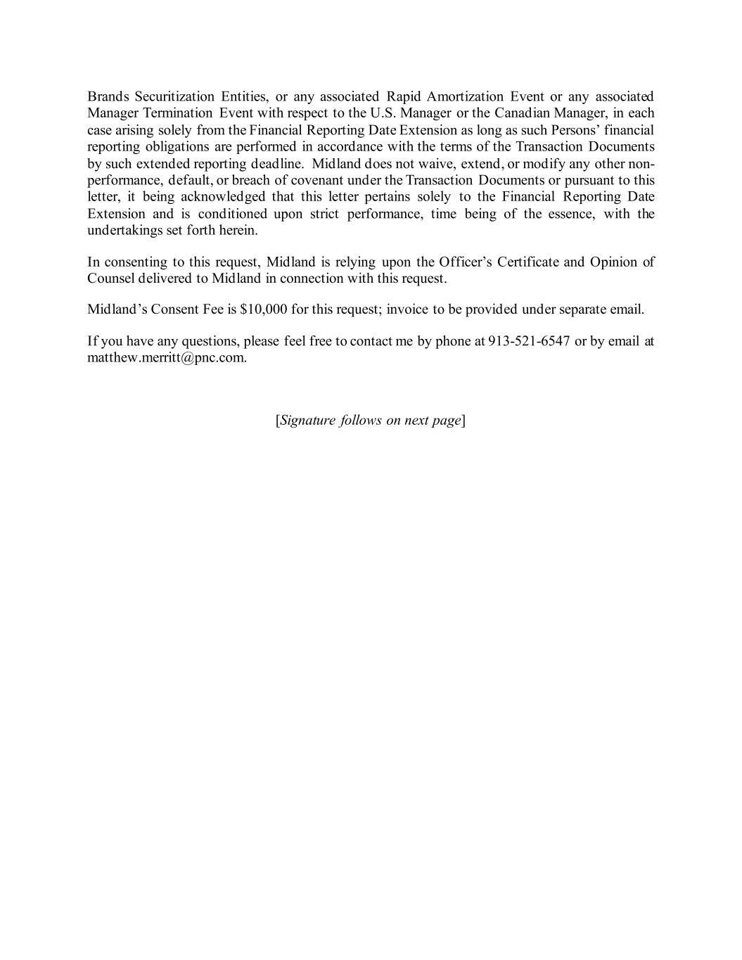 Brands Securitization Entities, or any associated Rapid Amortization Event or any associated Manager Termination Event with respect to the U.S. Manager or the Canadian Manager, in each case arising solely from the Financial Reporting Date Extension as long as such Persons’ financial reporting obligations are performed in accordance with the terms of the Transaction Documents by such extended reporting deadline. Midland does not waive, extend, or modify any other non- performance, default, or breach of covenant under the Transaction Documents or pursuant to this letter, it being acknowledged that this letter pertains solely to the Financial Reporting Date Extension and is conditioned upon strict performance, time being of the essence, with the undertakings set forth herein. In consenting to this request, Midland is relying upon the Officer’s Certificate and Opinion of Counsel delivered to Midland in connection with this request. Midland’s Consent Fee is $10,000 for this request; invoice to be provided under separate email. If you have any questions, please feel free to contact me by phone at 913-521-6547 or by email at matthew.merritt@pnc.com. [Signature follows on next page]