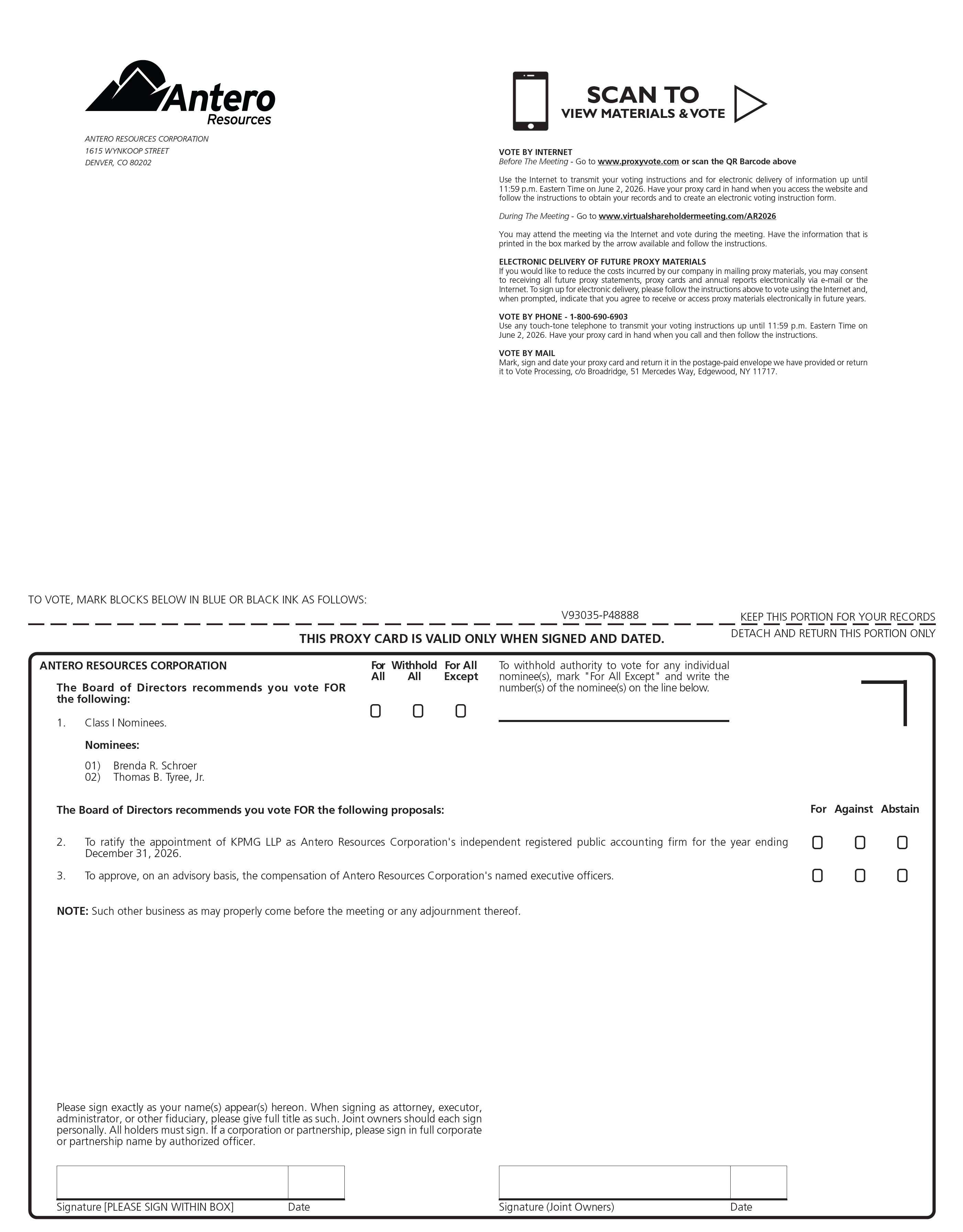 ANTERO RESOURCES CORPORATION 1615 WYNKOOP STREET DENVER, CO 80202 VOTE BY INTERNET Before The Meeting - Go to www.proxyvote.com or scan the QR Barcode above Use the Internet to transmit your voting instructions and for electronic delivery of information up until 11:59 p.m. Eastern Time on June 2, 2026. Have your proxy card in hand when you access the website and follow the instructions to obtain your records and to create an electronic voting instruction form. During The Meeting - Go to www.virtualshareholdermeeting.com/AR2026 You may attend the meeting via the Internet and vote during the meeting. Have the information that is printed in the box marked by the arrow available and follow the instructions. ELECTRONIC DELIVERY OF FUTURE PROXY MATERIALS If you would like to reduce the costs incurred by our company in mailing proxy materials, you may consent to receiving all future proxy statements, proxy cards and annual reports electronically via e-mail or the Internet. To sign up for electronic delivery, please follow the instructions above to vote using the Internet and, when prompted, indicate that you agree to receive or access proxy materials electronically in future years. VOTE BY PHONE - 1-800-690-6903 Use any touch-tone telephone to transmit your voting instructions up until 11:59 p.m. Eastern Time on June 2, 2026. Have your proxy card in hand when you call and then follow the instructions. VOTE BY MAIL Mark, sign and date your proxy card and return it in the postage-paid envelope we have provided or return it to Vote Processing, c/o Broadridge, 51 Mercedes Way, Edgewood, NY 11717 TO VOTE, MARK BLOCKS BELOW IN BLUE OR BLACK INK AS FOLLOWS: V93035-P48888 KEEP THIS PORTION FOR YOUR RECORDS THIS PROXY CARD IS VALID ONLY WHEN SIGNED AND DATED. DETACH AND RETURN THIS PORTION ONLY ANTERO RESOURCES CORPORATION The Board of Directors recommends you vote FOR the following: 1. Class I Nominees. Nominees: 01) Brenda R. Schroer 02) Thomas B. Tyree, Jr. For All Withhold All For All Except The Board of Directors recommends you vote FOR the following proposals: 2. To withhold authority to vote for any individual nominee(s), mark “For All Except” and write the number(s) of the nominee(s) on the line below. To ratify the appointment of KPMG LLP as Antero Resources Corporation’s independent registered public accounting firm for the year ending December 31, 2026. 3. To approve, on an advisory basis, the compensation of Antero Resources Corporation’s named executive officers. NOTE: Such other business as may properly come before the meeting or any adjournment thereof. Please sign exactly as your name(s) appear(s) hereon. When signing as attorney, executor, administrator, or other fiduciary, please give full title as such. Joint owners should each sign personally. All holders must sign. If a corporation or partnership, please sign in full corporate or partnership name by authorized officer. Date Signature (Joint Owners) For Against Abstain Signature [PLEASE SIGN WITHIN BOX] Date