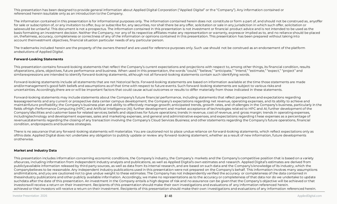 This presentation has been designed to provide general information about Applied Digital Corporation (“Applied Digital” or th e “Company”). Any information contained or referenced herein issuitable only as an introduction to the Company. The information contained in this presentation is for informational purposes only. The information contained herein does not constitute or form a part of, and should not be construed as, anyoffer for sale or subscription of, or any invitation to offer, buy or subscribe for, any securities, nor shall there be any offer, solicitation or sale in any jurisdiction in which such offer, solicitation or salewould be unlawful. This document is not a prospectus. The information contained in this presentation is not investment or financial product advice and is not intended to be used as the basis formaking an investment decision. Neither the Company, nor any of its respective affiliates make any representation or warranty, express or implied as to, and no reliance should be placed on, thefairness, accuracy, completeness or correctness of any of the information or opinions contained in this presentation. This presentation has been prepared without taking into account theinvestment objectives, financial situation particular needs of any particular person. The trademarks included herein are the property of the owners thereof and are used for reference purposes only. Such use should not be construed as an endorsement of the platform andsolutions of Applied Digital. Forward-Looking Statements This presentation contains forward-looking statements that reflect the Company’s current expectations and projections with respect to, among other things, its financial condition, results ofoperations, plans, objectives, future performance and business. When used in this presentation, the words “could,” “believe,” “anticipate,” “intend,” “estimate,” “expect,” “project” and similarexpressions are intended to identify forward-looking statements, although not all forward-looking statements contain such identifying words. Forward-looking statements include all statements that are not historical facts. Forward-looking statements are based on information available at the time those statements are made and/ormanagement’s good faith beliefs and assumptions as of that time with respect to future events. Such forward-looking statements are subject to various risks and uncertainties. Accordingly,there are or will be important factors that could cause actual outcomes or results to differ materially from those indicated in these statements. Forward-looking statements may include statements about the Company’s future financial performance, including statements that reflect perspectives and expectations regarding leaseagreements and any current or prospective data center campus development; the Company’s expectations regarding net revenue, operating expenses, and its ability to achieve and maintainfuture profitability; the Company’s business plan and ability to effectively manage growth; anticipated trends, growth rates, and ch allenges in the Company’s business, particularly in the fields ofHigh-Performance Computing (HPC) and Artificial Intelligence (AI); further development and market acceptance of technologies relat ed to HPC and AI; further development of the Company’sfacilities and customer base for related services; beliefs and objectives for future operations; trends in revenue, cost of revenue, and gross margin; trends in operating expenses, includingtechnology and development expenses, sales and marketing expenses, and general and administrative expenses, and expectations regarding t hese expenses as a percentage of revenue;statements regarding the closing of any transaction involving the Company's Cloud Services Business; and other statements regarding the Company’s future operations, financial condition, andprospects and business strategies. There is no assurance that any forward-looking statements will materialize. You are cautioned not to place undue reliance on forward-looking statements, which reflect expectations only as ofthis date. Applied Digital does not undertake any obligation to publicly update or review any forward-looking statement, whether as a result of new information, future developments orotherwise. Market and Industry Data This presentation includes information concerning economic conditions, the Company’s industry, the Company’s markets and the Company’s competitive position that is based on a variety ofsources, including information from independent industry analysts and publications, as well as Applied Digital’s own estimates and research. Applied Digital’s estimates are derived from publiclyavailable information released by third party sources, as well as data from its internal research, and are based on such data and the Company’s knowledge of its industry, which the Companybelieves to be reasonable. Any independent industry publications used in this presentation were not prepared on the Company’s behalf. This information involves many assumptions andlimitations, and you are cautioned not to give undue weight to these estimates. The Company has not independently verified the accuracy or completeness of the data contained in theseindustry publications and other publicly available information. Accordingly, we make no representations as to the accuracy or completeness of that data nor do we undertake to update suchdata after the date of this presentation. An investment in the Company entails a high degree of risk and no assurance can be given that the Company’s objective will be achieved or that investorswill receive a return on their investment. Recipients of this presentation should make their own investigations and evaluations of any information referenced herein. achieved or that investors will receive a return on their investment. Recipients of this presentation should make their own invest
