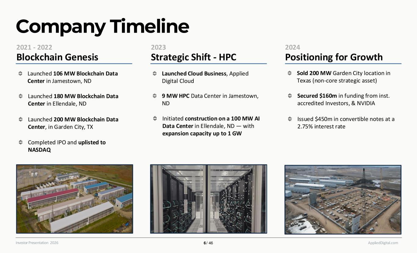 Company Timeline AppliedDigital.comInvestor Presentation 2026 7 / 46 AI Data Center Expansion 2025 AI Data Center Expansion 2026 CoreWeave - Signed three 15-year leases with three 5-year options for 3 buildings at Polaris Forge 1, utilizing 400 MW of IT load U.S. Based Investment-Grade Hyperscaler - Signed two 15-year leases with two 5-year options for 2 buildings at Polaris Forge 2, utilizing 200 MW of IT load Worked with Macquarie Asset Management for funding of up to $5.0 billion that can support over 2 GW of AI Data Center development U.S. Based High Investment-Grade Hyperscaler - Signed two 15-year leases with three 5-year options for 2 buildings at Delta Forge 1, utilizing 300 MW of IT load Plan to spin out the Applied Digital Cloud as a separate company