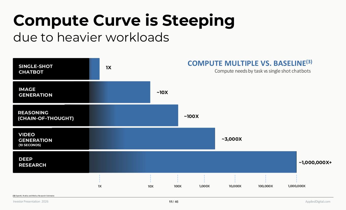AppliedDigital.comInvestor Presentation 2026 Compute Curve is Steeping due to heavier workloads 1X 10X 100X 1,000X 10,000X 100,000X 1,000,000X COMPUTE MULTIPLE VS. BASELINE(3) Compute needsby task vs single shot chatbots SINGLE-SHOT CHATBOT IMAGE GENERATION REASONING (CHAIN-OF-THOUGHT) VIDEO GENERATION (10 SECONDS) DEEP RESEARCH 1X ~10X ~100X ~1,000,000X+ ~3,000X (3) OpenAI, Nvidia and Melius Re search Estimates 11 / 46