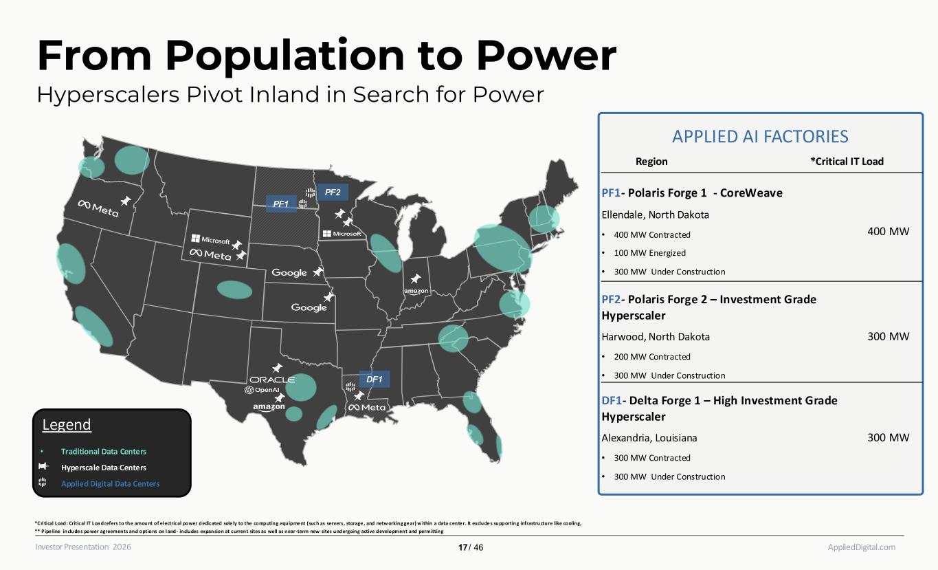 AppliedDigital.comInvestor Presentation 2026 From Population to Power Hyperscalers Pivot Inland in Search for Power • Traditional Data Centers • Hyperscale Data Centers • Applied Digital Data Centers Legend DF1 PF1 PF2 APPLIED AI FACTORIES PF1- Polaris Forge 1 - CoreWeave Ellendale, North Dakota • 400 MW Contracted • 100 MW Energized • 300 MW Under Construction 400 MW PF2- Polaris Forge 2 – Investment Grade Hyperscaler Harwood, North Dakota • 200 MW Contracted • 300 MW Under Construction 300 MW DF1- Delta Forge 1 – High Investment Grade Hyperscaler Alexandria, Louisiana • 300 MW Contracted • 300 MW Under Construction 300 MW Region *Critical IT Load *Cri ti cal Load: Critical IT Loa d refers to the amount of el ectrical power dedicated sole ly to the computing equipme nt (such as servers , storage , and netw orking ge ar) w ithin a data cente r. It exclude s supporting infrastructure like cooling, ** Pipe line include s power agreements and options on l and - includes expansion at current sites as well as near-term new sites undergoing active development and permitting 17 / 46