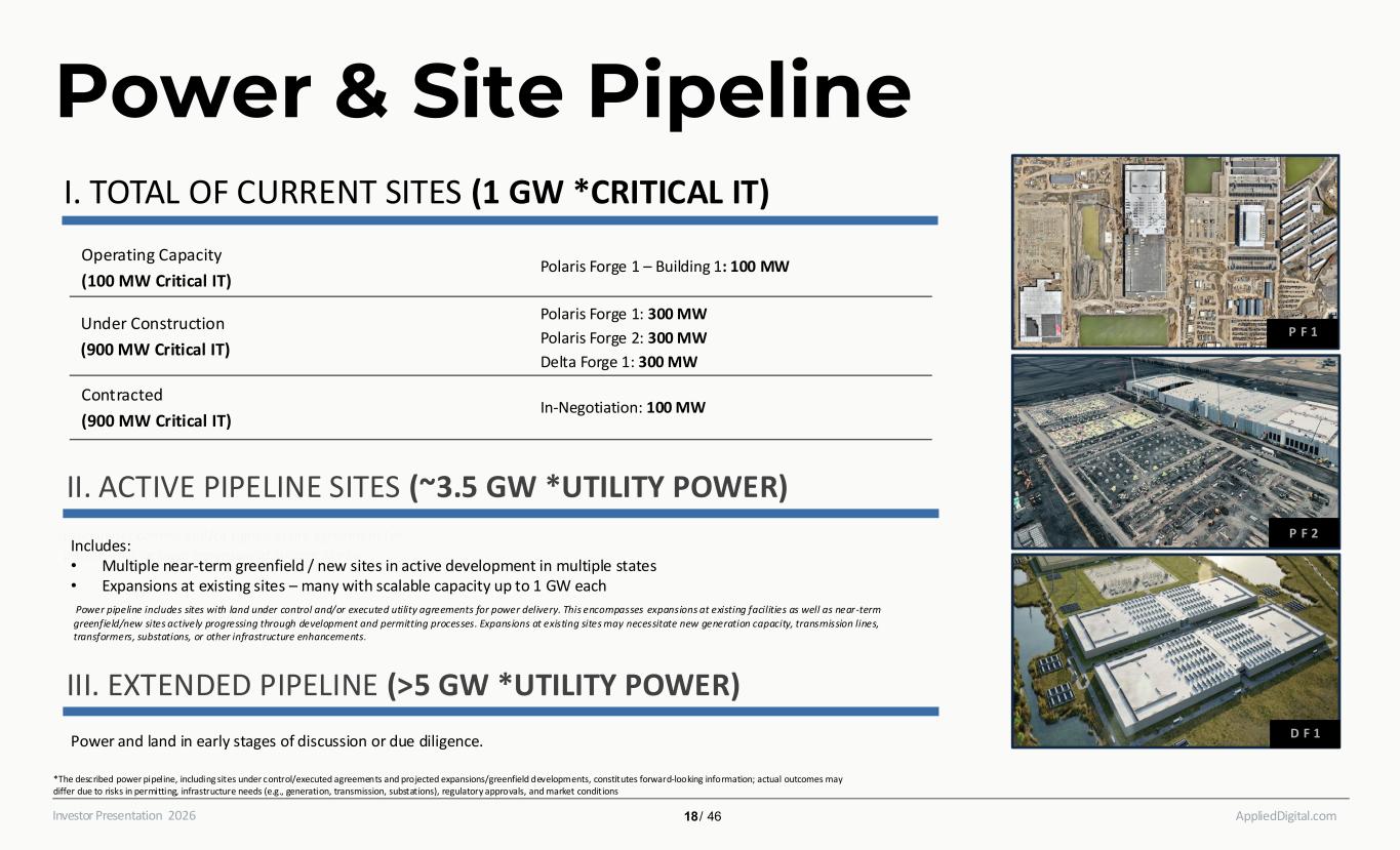 AppliedDigital.comInvestor Presentation 2026 *The described power pipeline, including sites under control/executed agreements and projected expansions/greenfield developments, constitutes forward-looking information; actual outcomes may differ due to risks in permitting, infrastructure needs (e.g., generation, transmission, substations), regulatory approvals, and market conditions Power & Site Pipeline I. TOTAL OF CURRENT SITES (1 GW *CRITICAL IT) P F 1 P F 2 D F 1 III. EXTENDED PIPELINE (>5 GW *UTILITY POWER) Power and land in early stages of discussion or due diligence. Under Construction (900 MW Critical IT) Polaris Forge 1: 300 MW Polaris Forge 2: 300 MW Delta Forge 1: 300 MW Polaris Forge 1 – Building 1: 100 MW Operating Capacity (100 MW Critical IT) In-Negotiation: 100 MW Contracted (900 MW Critical IT) II. ACTIVE PIPELINE SITES (~3.5 GW *UTILITY POWER) Includes: • Multiple near-term greenfield / new sites in active development in multiple states • Expansions at existing sites – many with scalable capacity up to 1 GW each Power pipeline includes sites with land under control and/or executed utility agreements for power delivery. This encompasses expansions at existing facilities as well as near-term greenfield/new sites actively progressing through development and permitting processes. Expansions at existing sites may necessitate new generation capacity, transmission lines, transformers, substations, or other infrastructure enhancements. 18 / 46