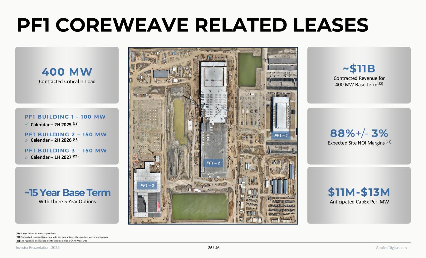 AppliedDigital.comInvestor Presentation 2026 PF1 COREWEAVE RELATED LEASES (21) Presented on a calendar-year basis (22) Contracted revenue figures exclude any amounts attributable to pass-through power (23) See Appendix on manage ment sche dule on Non-GAAP Measures 400 MW Contracted Critical IT Load ~15 Year Base Term With Three 5-Year Options ~$11B Contracted Revenue for 400 MW Base Term(22) 88%+/- 3% Expected Site NOI Margins (23) $11M-$13M Anticipated CapEx Per MW PF1 BUI LDING 1 - 100 MW ✓ Calendar – 2H 2025 (21) PF1 BUI LDING 2 – 150 MW PF1 BUILDING 3 – 150 MW o Calendar – 2H 2026 (21) o Calendar – 1H 2027 (21) PF1 – 1 PF1 – 2 PF1 – 3 25 / 46