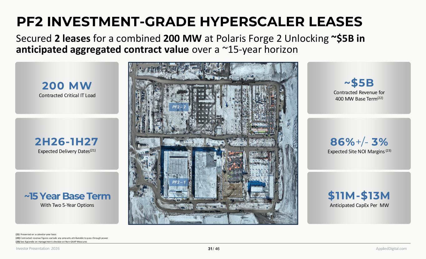 AppliedDigital.comInvestor Presentation 2026 PF2 INVESTMENT-GRADE HYPERSCALER LEASES 200 MW Contracted Critical IT Load ~15 Year Base Term With Two 5-Year Options ~$5B Contracted Revenue for 400 MW Base Term(22) 86%+/- 3% Expected Site NOI Margins (23) $11M-$13M Anticipated CapEx Per MW PF2 – 2 PF2 – 1 Secured 2 leases for a combined 200 MW at Polaris Forge 2 Unlocking ~$5B in anticipated aggregated contract value over a ~15-year horizon 2H26-1H27 Expected Delivery Dates(21) (21) Presented on a calendar-year basis (22) Contracted revenue figures exclude any amounts attributable to pass-through power (23) See Appendix on manage ment sche dule on Non-GAAP Measures 31 / 46