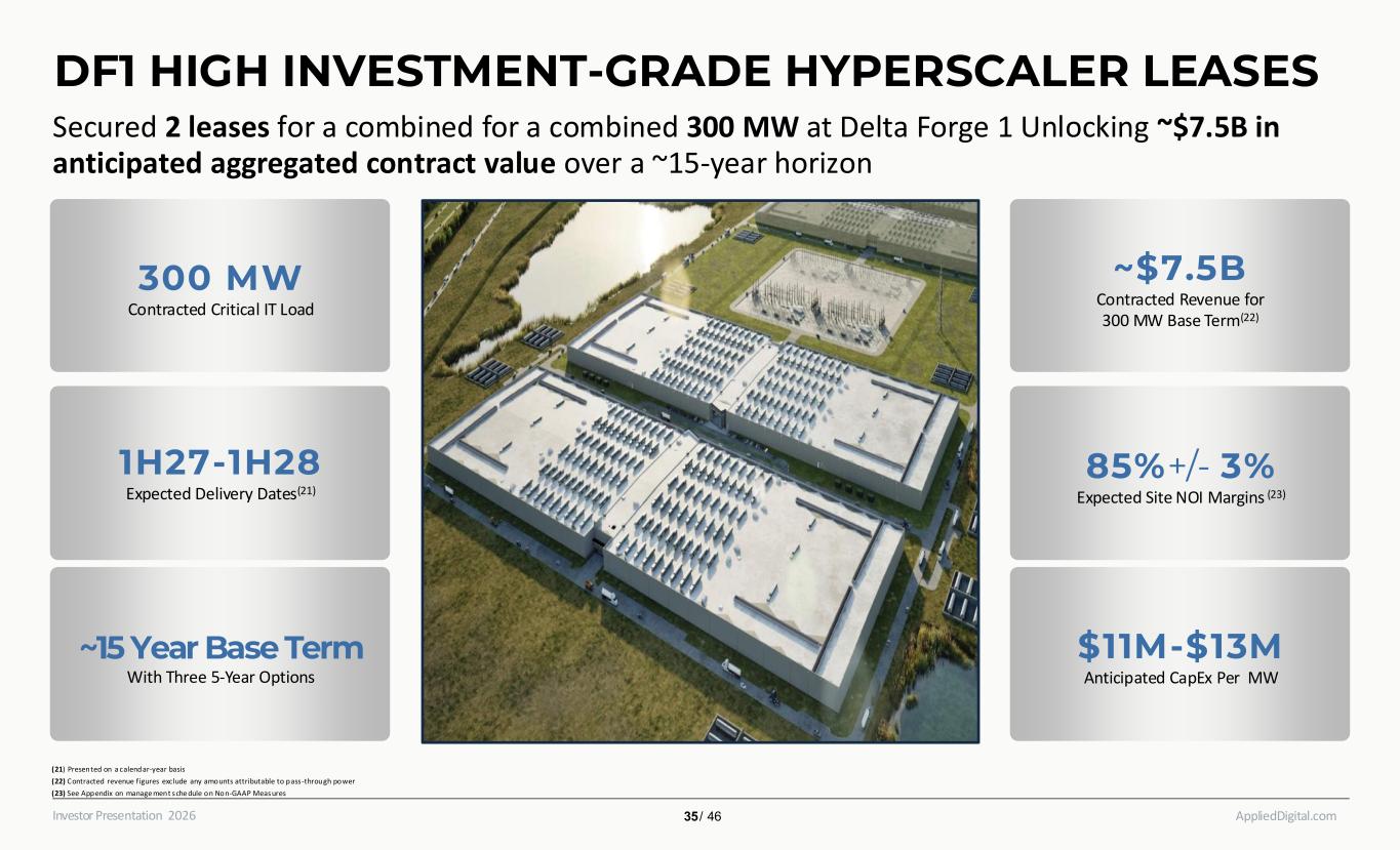 AppliedDigital.comInvestor Presentation 2026 300 MW Contracted Critical IT Load ~15 Year Base Term With Three 5-Year Options ~$7.5B Contracted Revenue for 300 MW Base Term(22) 85%+/- 3% Expected Site NOI Margins (23) $11M-$13M Anticipated CapEx Per MW 1H27-1H28 Expected Delivery Dates(21) (21) Presented on a calendar-year basis (22) Contracted revenue figures exclude any amounts attributable to pass-through power (23) See Appendix on manage ment sche dule on Non-GAAP Measures 35 / 46 DF1 HIGH INVESTMENT-GRADE HYPERSCALER LEASES Secured 2 leases for a combined for a combined 300 MW at Delta Forge 1 Unlocking ~$7.5B in anticipated aggregated contract value over a ~15-year horizon