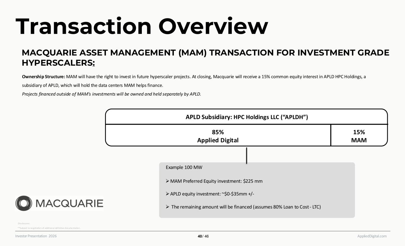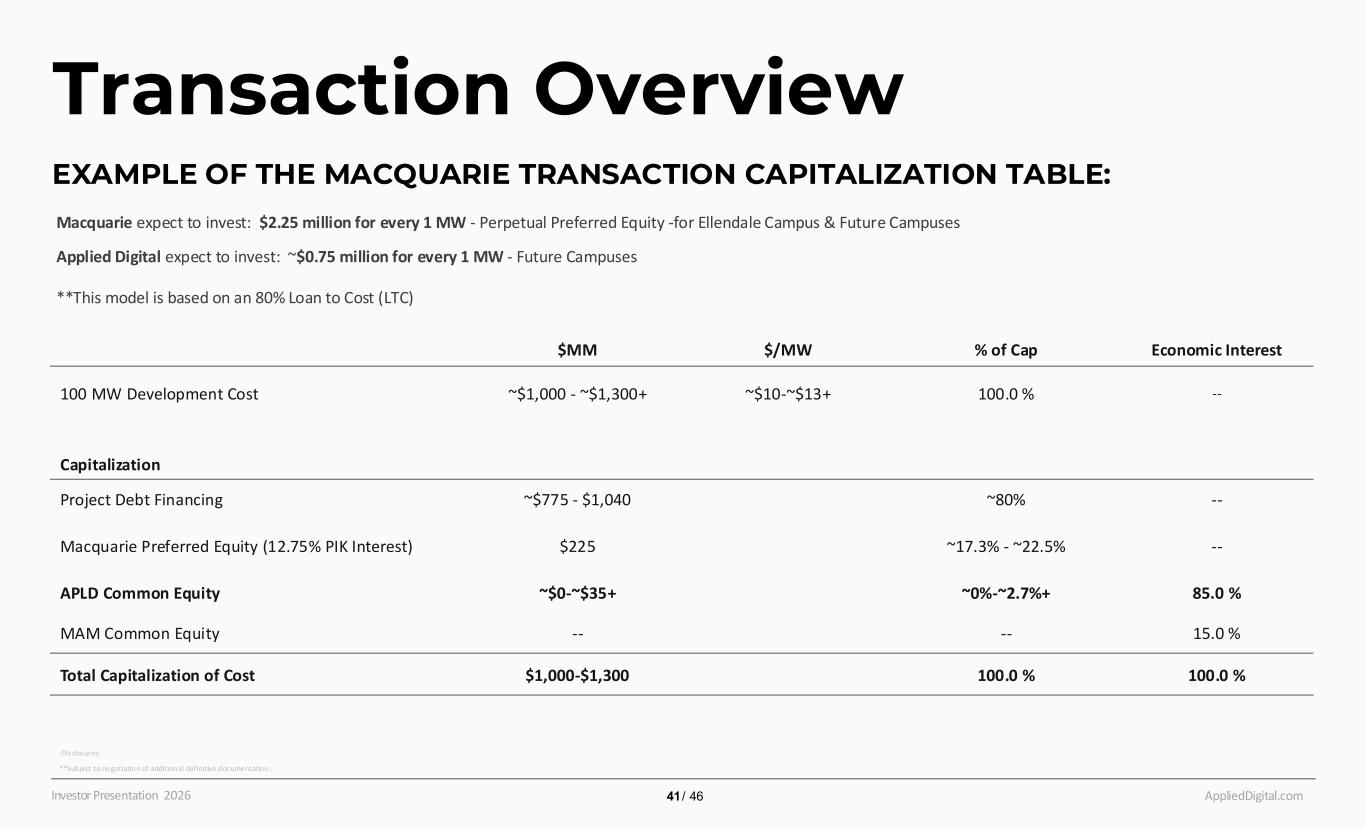 AppliedDigital.comInvestor Presentation 2026 Transaction Overview EXAMPLE OF THE MACQUARIE TRANSACTION CAPITALIZATION TABLE: Macquarie expect to invest: $2.25 million for every 1 MW - Perpetual Preferred Equity -for Ellendale Campus & Future Campuses Applied Digital expect to invest: ~$0.75 million for every 1 MW - Future Campuses **This model is based on an 80% Loan to Cost (LTC) $MM $/MW % of Cap Economic Interest 100 MW Development Cost ~$1,000 - ~$1,300+ ~$10-~$13+ 100.0 % -- Capitalization Project Debt Financing ~$775 - $1,040 ~80% -- Macquarie Preferred Equity (12.75% PIK Interest) $225 ~17.3% - ~22.5% -- APLD Common Equity ~$0-~$35+ ~0%-~2.7%+ 85.0 % MAM Common Equity -- -- 15.0 % Total Capitalization of Cost $1,000-$1,300 100.0 % 100.0 % :Disclosures: **Subject to ne gotiation of additional definitive docume ntation . 41 / 46