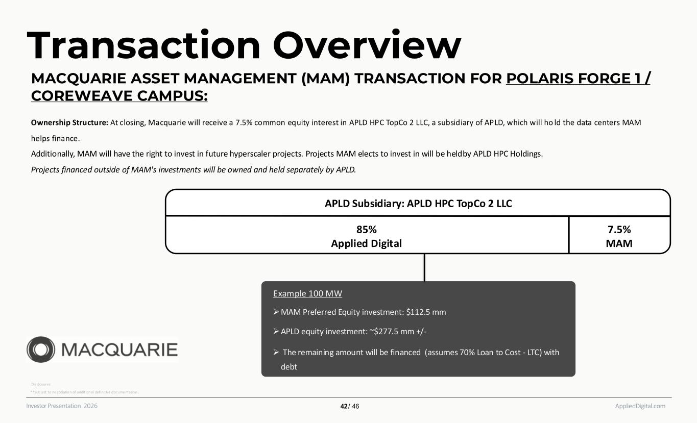 AppliedDigital.comInvestor Presentation 2026 Transaction Overview MACQUARIE ASSET MANAGEMENT (MAM) TRANSACTION FOR POLARIS FORGE 1 / COREWEAVE CAMPUS: APLD Subsidiary: APLD HPC TopCo 2 LLC 85% Applied Digital 7.5% MAM Example 100 MW ➢MAM Preferred Equity investment: $112.5 mm ➢APLD equity investment: ~$277.5 mm +/- ➢ The remaining amount will be financed (assumes 70% Loan to Cost - LTC) with debt Ownership Structure: At closing, Macquarie will receive a 7.5% common equity interest in APLD HPC TopCo 2 LLC, a subsidiary of APLD, which will ho ld the data centers MAM helps finance. Additionally, MAM will have the right to invest in future hyperscaler projects. Projects MAM elects to invest in will be held by APLD HPC Holdings. Projects financed outside of MAM's investments will be owned and held separately by APLD. :Disclosures: **Subject to ne gotiation of additional definitive docume ntation . 42 / 46