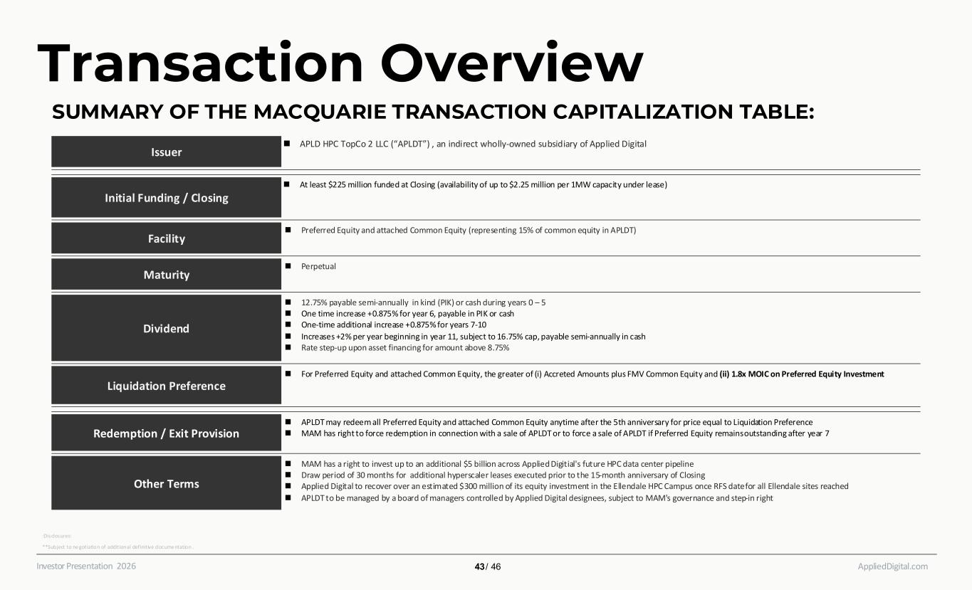 AppliedDigital.comInvestor Presentation 2026 Transaction Overview SUMMARY OF THE MACQUARIE TRANSACTION CAPITALIZATION TABLE: Issuer ◼ APLD HPC TopCo 2 LLC (“APLDT”) , an indirect wholly-owned subsidiary of Applied Digital Initial Funding / Closing ◼ At least $225 million funded at Closing (availability of up to $2.25 million per 1MW capacity under lease) Facility ◼ Preferred Equity and attached Common Equity (representing 15% of common equity in APLDT) Maturity ◼ Perpetual Dividend ◼ 12.75% payable semi-annually in kind (PIK) or cash during years 0 – 5 ◼ One time increase +0.875% for year 6, payable in PIK or cash ◼ One-time additional increase +0.875% for years 7-10 ◼ Increases +2% per year beginning in year 11, subject to 16.75% cap, payable semi-annually in cash ◼ Rate step-up upon asset financing for amount above 8.75% Liquidation Preference ◼ For Preferred Equity and attached Common Equity, the greater of (i) Accreted Amounts plus FMV Common Equity and (ii) 1.8x MOIC on Preferred Equity Investment Redemption / Exit Provision ◼ APLDT may redeem all Preferred Equity and attached Common Equity anytime after the 5th anniversary for price equal to Liquidation Preference ◼ MAM has right to force redemption in connection with a sale of APLDT or to force a sale of APLDT if Preferred Equity remains outstanding after year 7 Other Terms ◼ MAM has a right to invest up to an additional $5 billion across Applied Digitial's future HPC data center pipeline ◼ Draw period of 30 months for additional hyperscaler leases executed prior to the 15-month anniversary of Closing ◼ Applied Digital to recover over an estimated $300 million of its equity investment in the Ellendale HPC Campus once RFS date for all Ellendale sites reached ◼ APLDT to be managed by a board of managers controlled by Applied Digital designees, subject to MAM's governance and step-in right :Disclosures: **Subject to ne gotiation of additional definitive docume ntation . 43 / 46