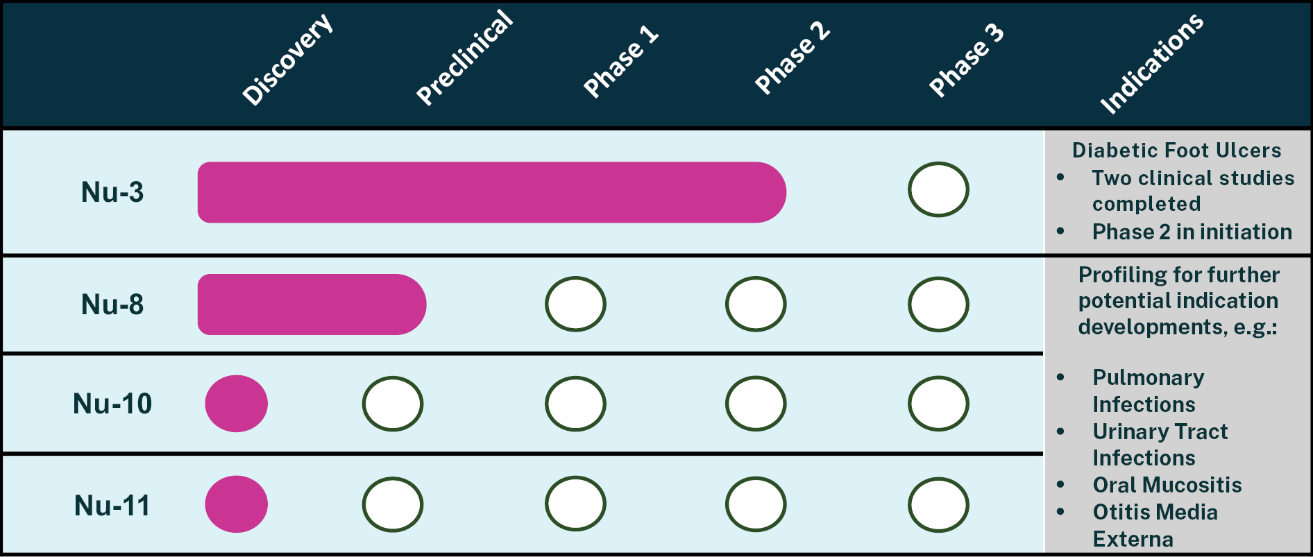 Our product candidates consist of antimicrobials targeting acute and chronic infectious diseases, which are delivered locally to the site of infection. As of March 2026, we hold 68 issued and 36 pending patent applications for our products and technologies, with coverage in major pharmaceutical markets. We have successfully completed our first exploratory human clinical trials for our lead product, the broad-spectrum Bisphosphocin® (anti-bacterial) Nu-3, which is being developed for the topical treatment of mildly infected diabetic foot ulcers (iDFU). We plan to conduct an initial Phase 2a safety and dose response study, followed by a placebo-controlled Phase 2b dose comparative study to identify the optimal dose for Phase 3 trials and eventual commercialization. This study will also determine the most appropriate administration regimen for Nu-3 gel formation in mildly infected diabetic foot ulcers. Additionally, we are advancing early-stage pipeline compounds and are focused on further characterizing them to identify the best clinical indications for non-clinical and clinical evaluation. Advancement of any of our product candidates to the commercialization stage is completely dependent on the outcome of clinical studies that are reviewed and approved by the FDA or other comparable regulatory authorities.