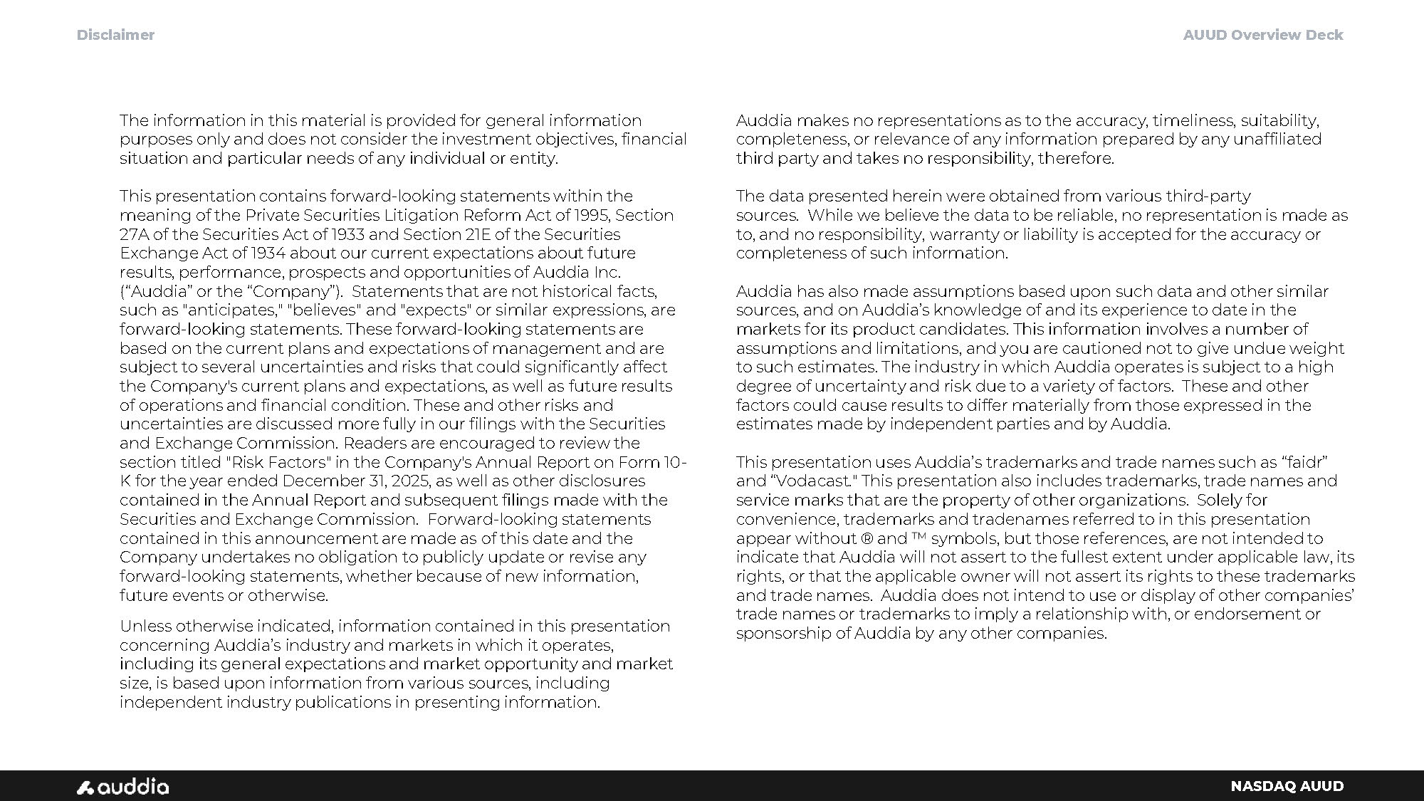 AUUD Overview Deck NASDAQ AUUD Disclaimer The information in this material is provided for general information purposes only and does not consider the investment objectives, financial situation and particular needs of any individual or entity. This presentation contains forward - looking statements within the meaning of the Private Securities Litigation Reform Act of 1995, Section 27A of the Securities Act of 1933 and Section 21E of the Securities Exchange Act of 1934 about our current expectations about future results, performance, prospects and opportunities of Auddia Inc. (“Auddia” or the “Company”). Statements that are not historical facts, such as "anticipates," "believes" and "expects" or similar expressions, are forward - looking statements. These forward - looking statements are based on the current plans and expectations of management and are subject to several uncertainties and risks that could significantly affect the Company's current plans and expectations, as well as future results of operations and financial condition. These and other risks and uncertainties are discussed more fully in our filings with the Securities and Exchange Commission. Readers are encouraged to review the section titled "Risk Factors" in the Company's Annual Report on Form 10 - K for the year ended December 31, 2025, as well as other disclosures contained in the Annual Report and subsequent filings made with the Securities and Exchange Commission. Forward - looking statements contained in this announcement are made as of this date and the Company undertakes no obligation to publicly update or revise any forward - looking statements, whether because of new information, future events or otherwise. Unless otherwise indicated, information contained in this presentation concerning Auddia’s industry and markets in which it operates, including its general expectations and market opportunity and market size, is based upon information from various sources, including independent industry publications in presenting information. Auddia makes no representations as to the accuracy, timeliness, suitability, completeness, or relevance of any information prepared by any unaffiliated third party and takes no responsibility, therefore. The data presented herein were obtained from various third - party sources. While we believe the data to be reliable, no representation is made as to, and no responsibility, warranty or liability is accepted for the accuracy or completeness of such information. Auddia has also made assumptions based upon such data and other similar sources, and on Auddia’s knowledge of and its experience to date in the markets for its product candidates. This information involves a number of assumptions and limitations, and you are cautioned not to give undue weight to such estimates. The industry in which Auddia operates is subject to a high degree of uncertainty and risk due to a variety of factors. These and other factors could cause results to differ materially from those expressed in the estimates made by independent parties and by Auddia. This presentation uses Auddia’s trademarks and trade names such as “faidr” and “Vodacast." This presentation also includes trademarks, trade names and service marks that are the property of other organizations. Solely for convenience, trademarks and tradenames referred to in this presentation appear without ® and symbols, but those references, are not intended to indicate that Auddia will not assert to the fullest extent under applicable law, its rights, or that the applicable owner will not assert its rights to these trademarks and trade names. Auddia does not intend to use or display of other companies’ trade names or trademarks to imply a relationship with, or endorsement or sponsorship of Auddia by any other companies.