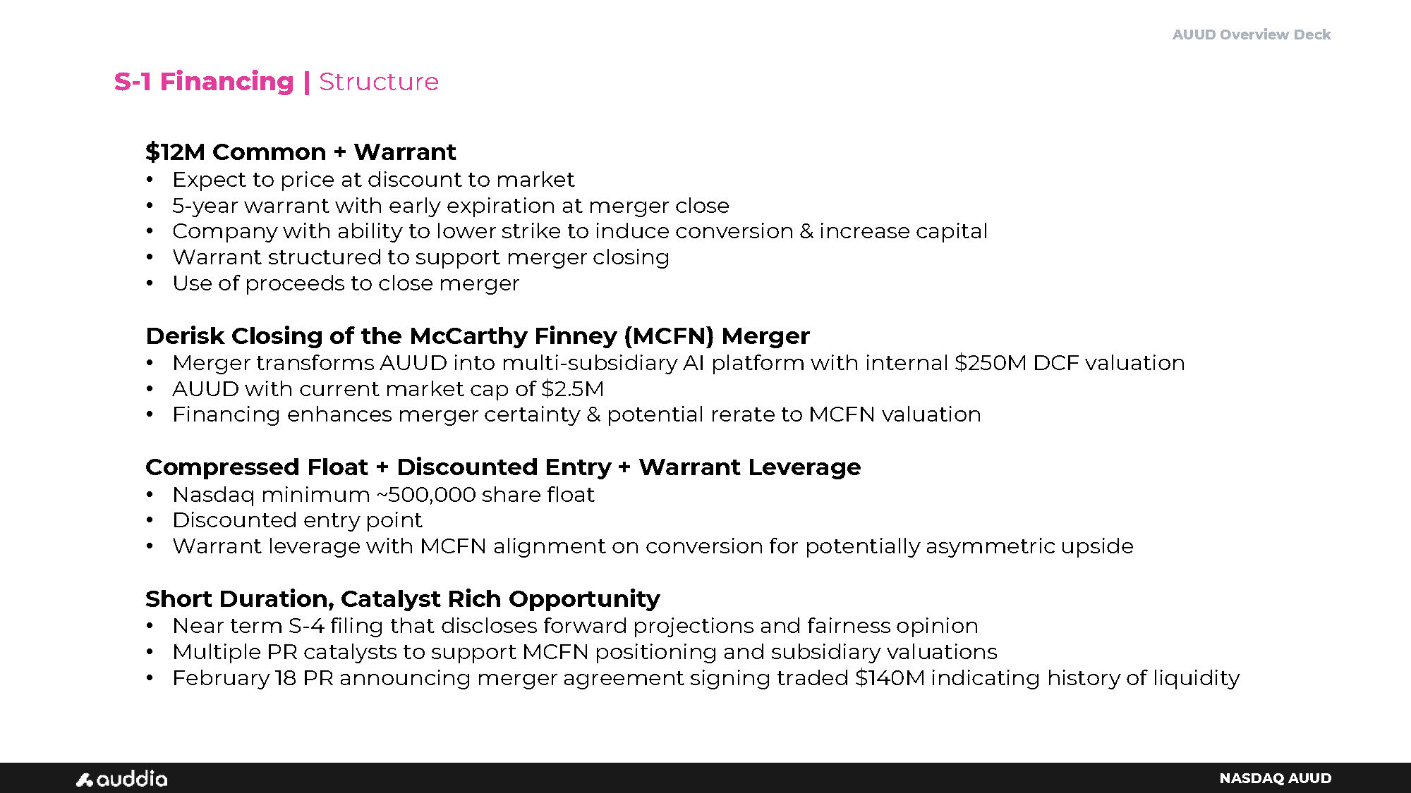 AUUD Overview Deck NASDAQ AUUD $12M Common + Warrant • Expect to price at discount to market • 5 - year warrant with early expiration at merger close • Company with ability to lower strike to induce conversion & increase capital • Warrant structured to support merger closing • Use of proceeds to close merger Derisk Closing of the McCarthy Finney (MCFN) Merger • Merger transforms AUUD into multi - subsidiary AI platform with internal $250M DCF valuation • AUUD with current market cap of $2.5M • Financing enhances merger certainty & potential rerate to MCFN valuation Compressed Float + Discounted Entry + Warrant Leverage • Nasdaq minimum ~500,000 share float • Discounted entry point • Warrant leverage with MCFN alignment on conversion for potentially asymmetric upside Short Duration, Catalyst Rich Opportunity • Near term S - 4 filing that discloses forward projections and fairness opinion • Multiple PR catalysts to support MCFN positioning and subsidiary valuations • February 18 PR announcing merger agreement signing traded $140M indicating history of liquidity S - 1 Financing | Structure