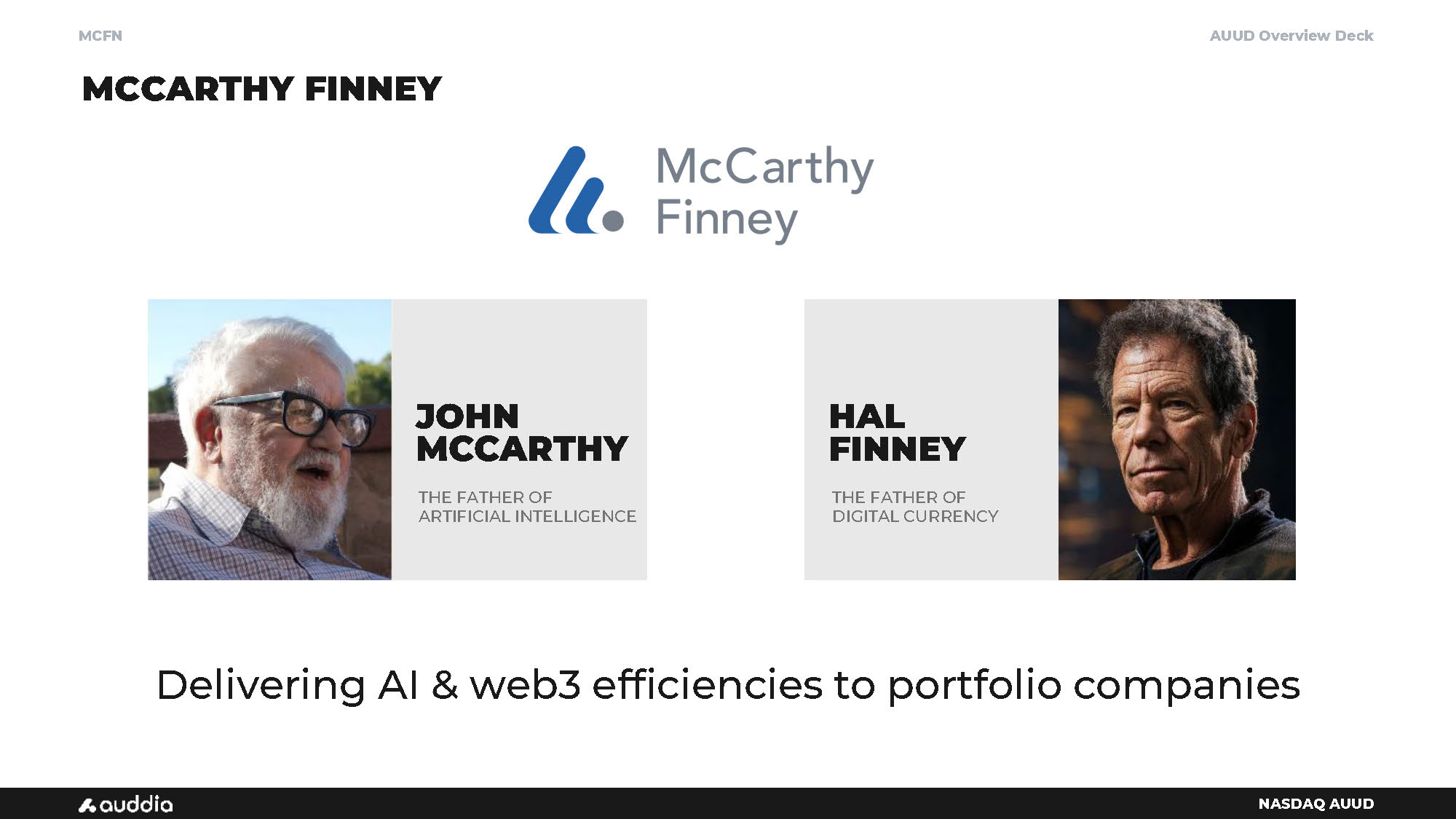 AUUD Overview Deck NASDAQ AUUD MCCARTHY FINNEY MCFN Delivering AI & web3 efficiencies to portfolio companies HAL FINNEY JOHN MCCARTHY THE FATHER OF ARTIFICIAL INTELLIGENCE THE FATHER OF DIGITAL CURRENCY