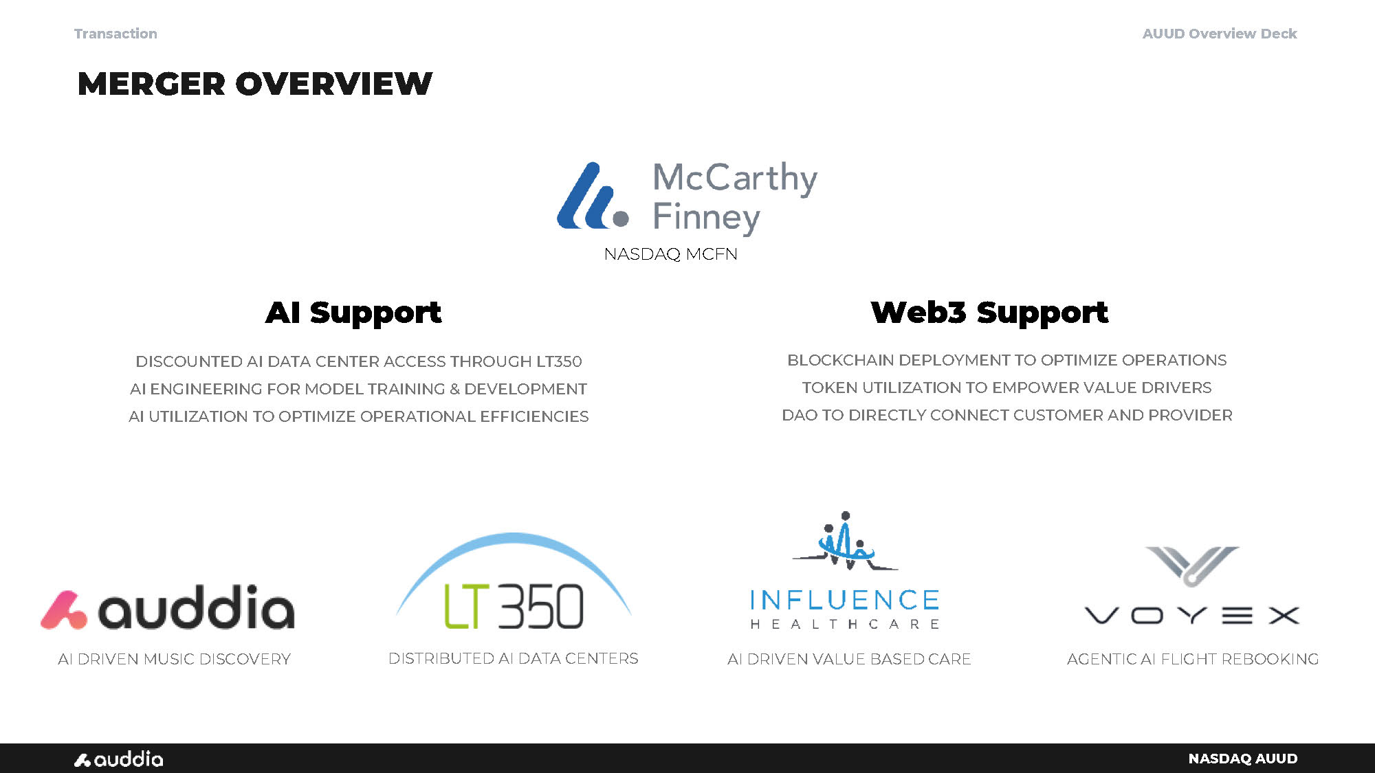AUUD Overview Deck NASDAQ AUUD MERGER OVERVIEW Transaction NASDAQ MCFN AI Support DISCOUNTED AI DATA CENTER ACCESS THROUGH LT350 AI ENGINEERING FOR MODEL TRAINING & DEVELOPMENT AI UTILIZATION TO OPTIMIZE OPERATIONAL EFFICIENCIES DISTRIBUTED AI DATA CENTERS AI DRIVEN VALUE BASED CARE AGENTIC AI FLIGHT REBOOKING AI DRIVEN MUSIC DISCOVERY Web3 Support BLOCKCHAIN DEPLOYMENT TO OPTIMIZE OPERATIONS TOKEN UTILIZATION TO EMPOWER VALUE DRIVERS DAO TO DIRECTLY CONNECT CUSTOMER AND PROVIDER