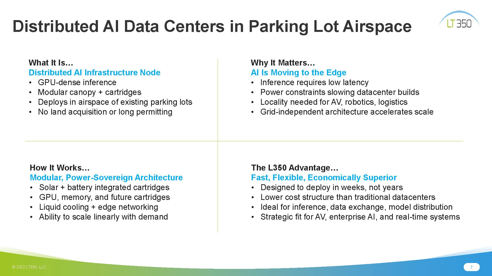 7 © 2022 LT350, LLC The L350 Advantage… Fast, Flexible, Economically Superior • Designed to deploy in weeks, not years • Lower cost structure than traditional datacenters • Ideal for inference, data exchange, model distribution • Strategic fit for AV, enterprise AI, and real - time systems How It Works… Modular, Power - Sovereign Architecture • Solar + battery integrated cartridges • GPU , memory, and future cartridges • Liquid cooling + edge networking • Ability to s cale linearly with demand Why It Matters… AI Is Moving to the Edge • Inference requires low latency • Power constraints slowing datacenter builds • Locality needed for AV, robotics, logistics • Grid - independent architecture accelerates scale What It Is… Distributed AI Infrastructure Node • GPU - dense inference • Modular canopy + cartridges • Deploys in airspace of existing parking lots • No land acquisition or long permitting Distributed AI Data Centers in Parking Lot Airspace