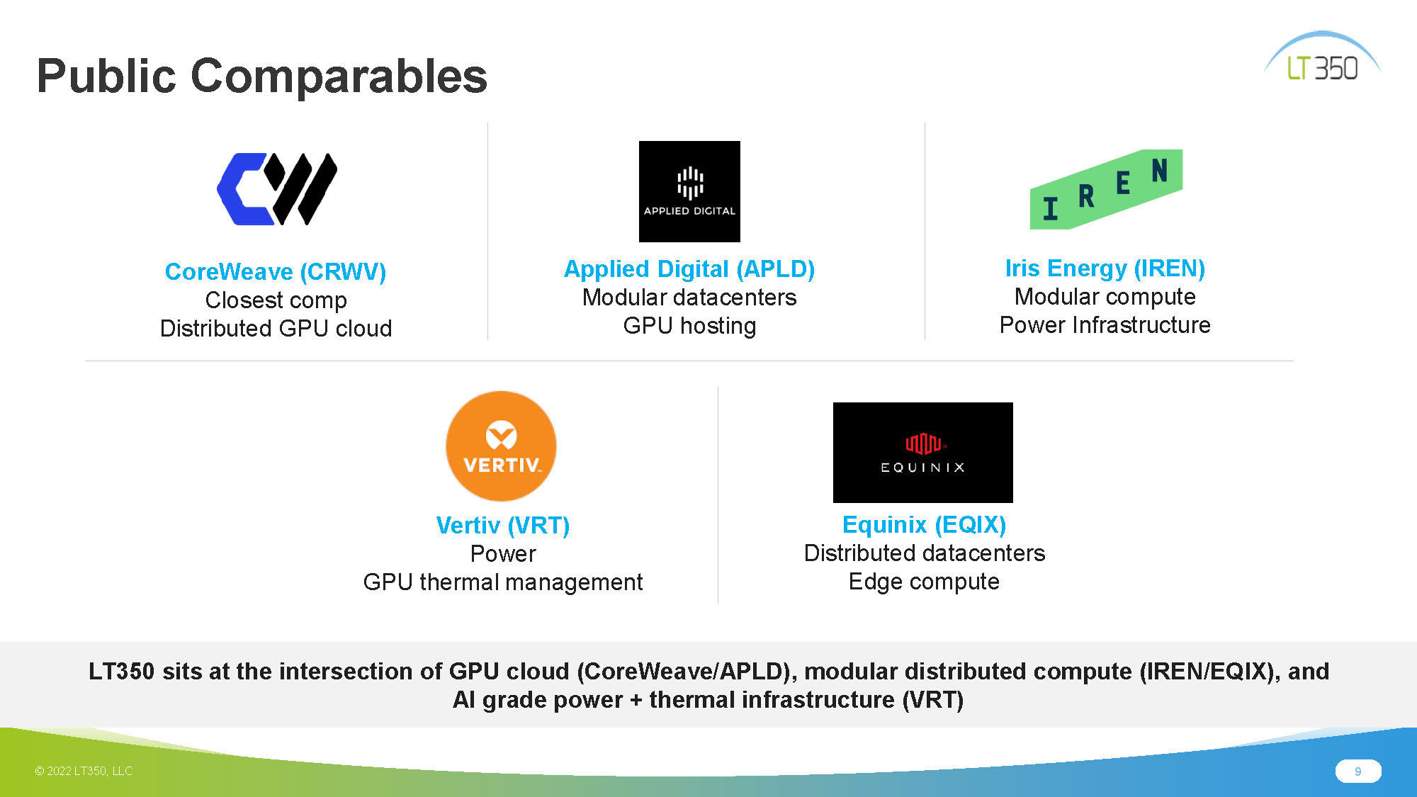 9 © 2022 LT350, LLC Public Comparables CoreWeave (CRWV) Closest comp Distributed GPU cloud Applied Digital (APLD) Modular datacenters GPU hosting Iris Energy (IREN) Modular compute Power Infrastructure Vertiv (VRT) Power GPU t hermal m anagement Equinix (EQIX) Distributed datacenters Edge compute LT350 sits at the intersection of GPU cloud (CoreWeave/APLD), modular distributed compute (IREN/EQIX), and AI grade power + thermal infrastructure (VRT)