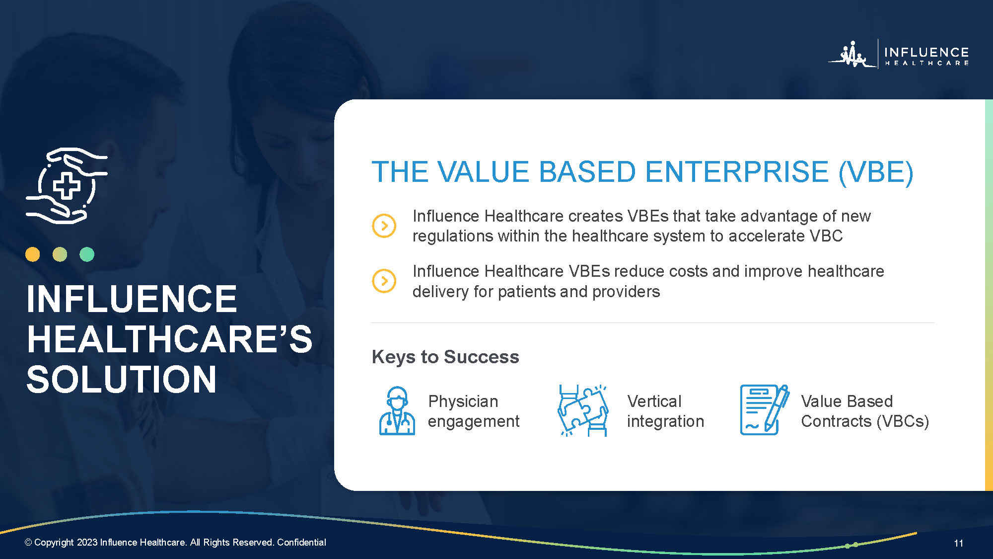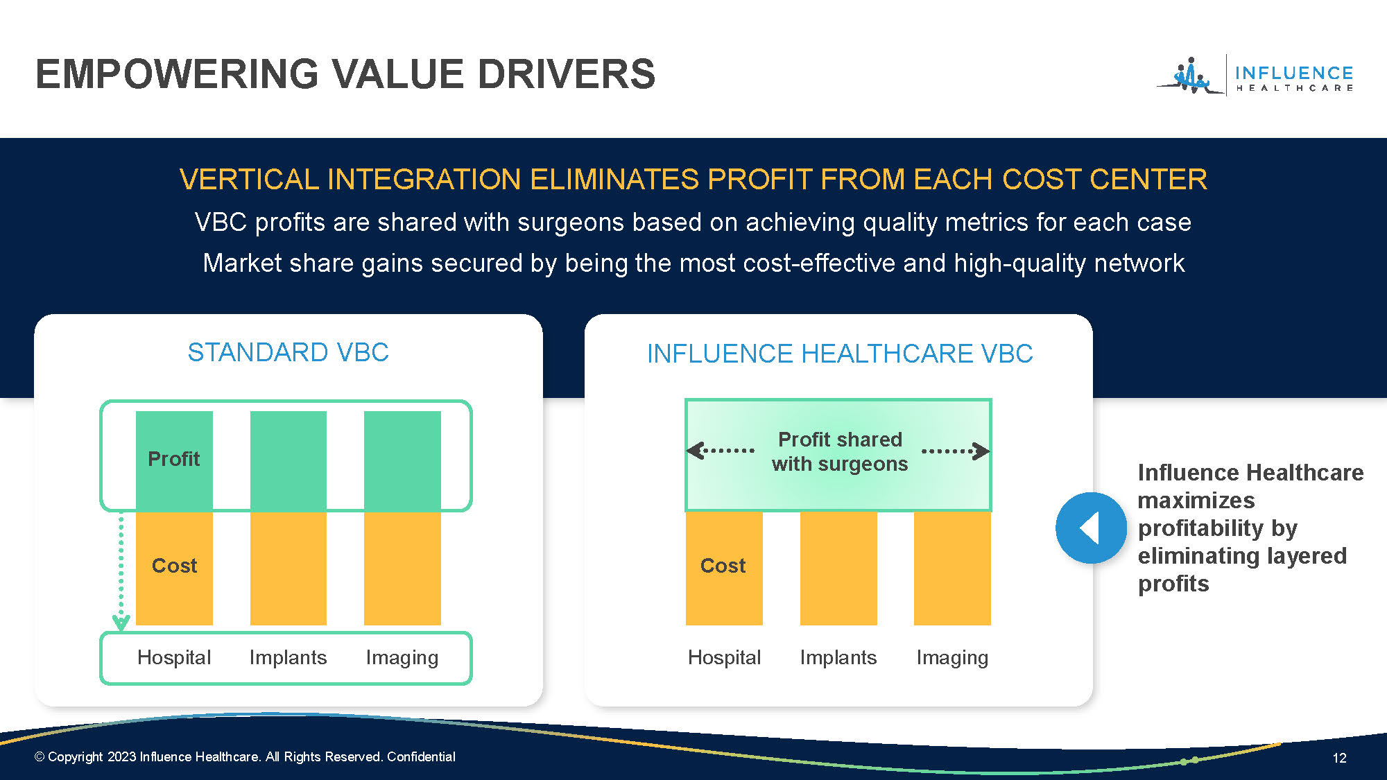 11 © Copyright 2023 Influence Healthcare. All Rights Reserved. Confidential Footer Keys to Success Physician engagement Vertical integration Value Based Contracts (VBCs) THE VALUE BASED ENTERPRISE (VBE) Influence Healthcare creates VBEs that take advantage of new regulations within the healthcare system to accelerate VBC Influence Healthcare VBEs reduce costs and improve healthcare delivery for patients and providers INFLUENCE HEALTHCARE’S SOLUTION 11 © Copyright 2023 Influence Healthcare. All Rights Reserved. Confidential