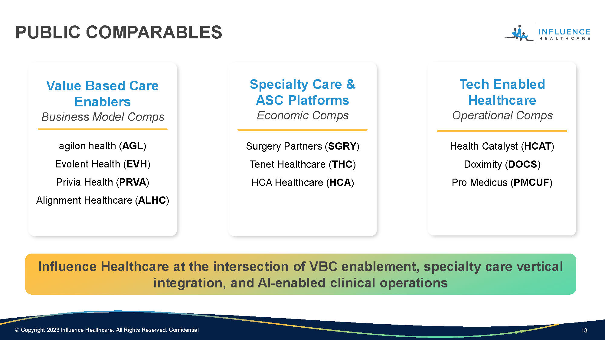 13 © Copyright 2023 Influence Healthcare. All Rights Reserved. Confidential PUBLIC COMPARABLES Value Based Care Enablers Business Model Comps agilon health ( AGL ) Evolent Health ( EVH ) Privia Health ( PRVA ) Alignment Healthcare ( ALHC ) Specialty Care & ASC Platforms Economic Comps Surgery Partners ( SGRY ) Tenet Healthcare ( THC ) HCA Healthcare ( HCA ) Tech Enabled Healthcare Operational Comps Health Catalyst ( HCAT ) Doximity ( DOCS ) Pro Medicus ( PMCUF ) Influence Healthcare at the intersection of VBC enablement, specialty care vertical integration, and AI - enabled clinical operations