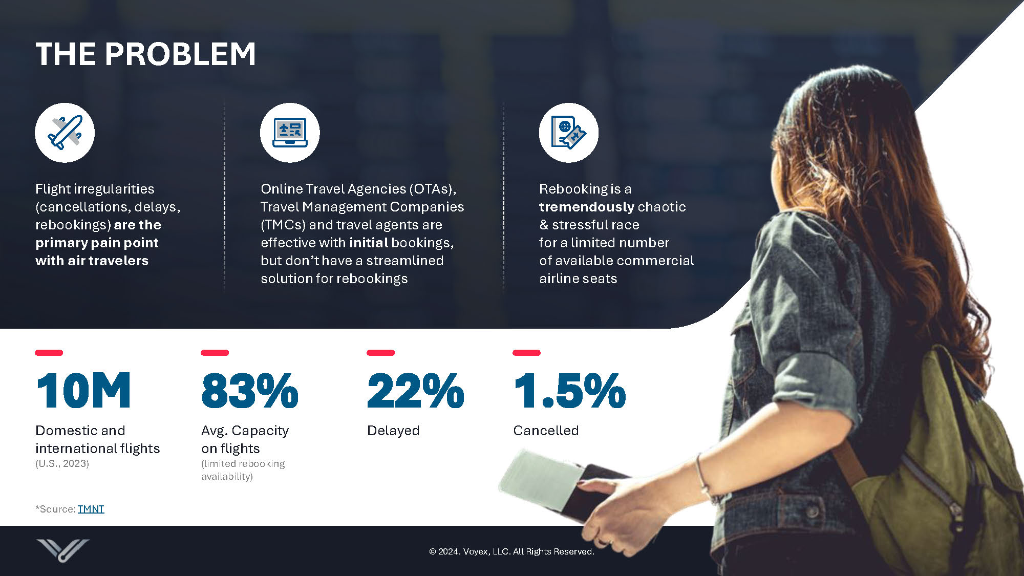 15 © 2024. Voyex , LLC. All Rights Reserved. THE PROBLEM *Source: TMNT © 2024. Voyex, LLC. All Rights Reserved. Flight irregularities (cancellations, delays, rebookings) are the primary pain point with air travelers Online Travel Agencies (OTAs), Travel Management Companies (TMCs) and travel agents are effective with initial bookings, but don’t have a streamlined solution for rebookings 10M Domestic and international flights (U.S., 2023) 22% Delayed 83% Avg. Capacity on flights (limited rebooking availability) 15 Rebooking is a tremendously chaotic & stressful race for a limited number of available commercial airline seats 1.5% Cancelled