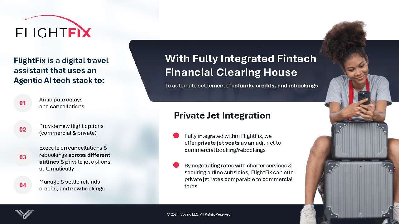 FlightFix is a digital travel assistant that uses an Agentic AI tech stack to: Anticipate delays and cancellations 01 Provide new flight options (commercial & private) 02 Execute on cancellations & rebookings across different airlines & private jet options automatically 03 Manage & settle refunds, credits, and new bookings 04 Private Jet Integration Fully integrated within FlightFix, we offer private jet seats as an adjunct to commercial booking/rebookings By negotiating rates with charter services & securing airline subsidies, FlightFix can offer private jet rates comparable to commercial fares With Fully Integrated Fintech Financial Clearing House To automate settlement of refunds, credits, and rebookings © 2024. Voyex , LLC. All Rights Reserved. © 2024. Voyex , LLC. All Rights Reserved. 16