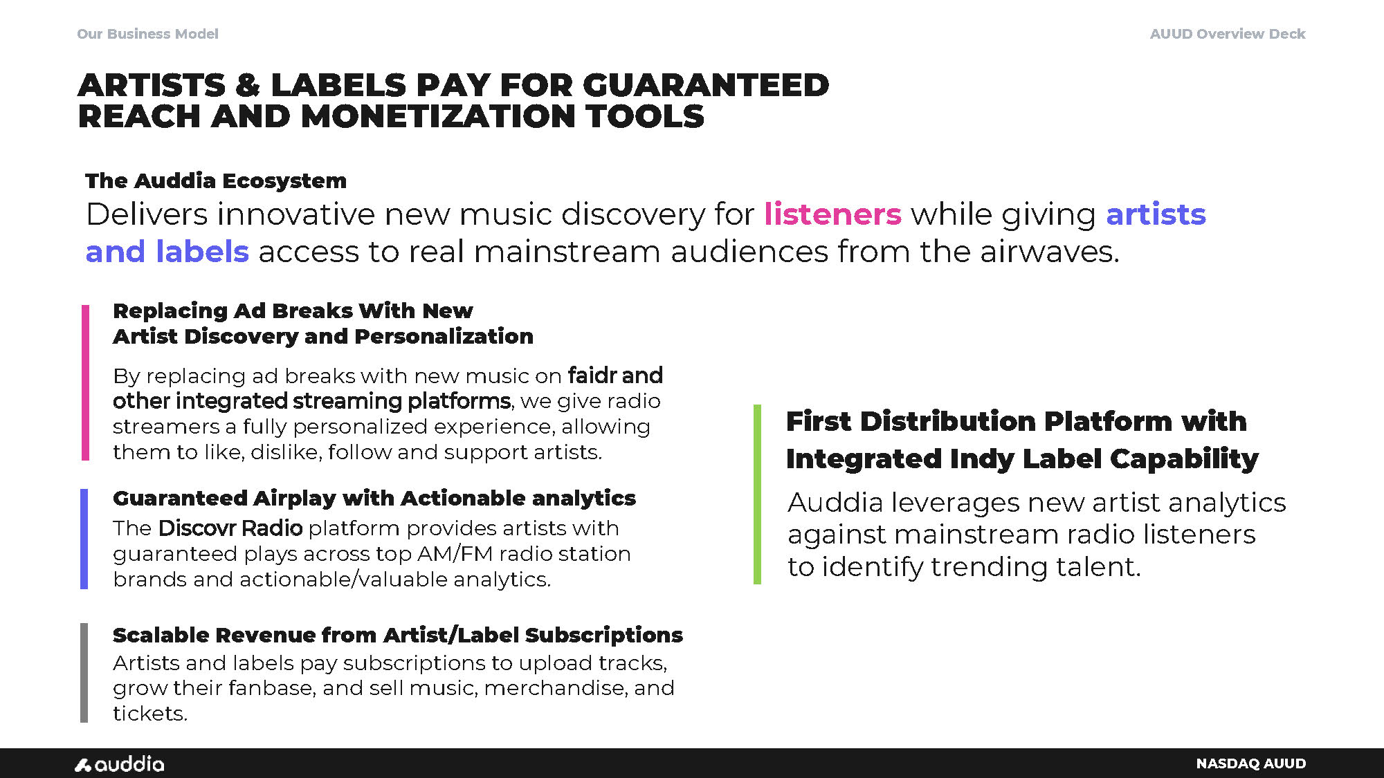 AUUD Overview Deck NASDAQ AUUD The Auddia Ecosystem Delivers innovative new music discovery for listeners while giving artists and labels access to real mainstream audiences from the airwaves. ARTISTS & LABELS PAY FOR GUARANTEED REACH AND MONETIZATION TOOLS Replacing Ad Breaks With New Artist Discovery and Personalization By replacing ad breaks with new music on faidr and other integrated streaming platforms , we give radio streamers a fully personalized experience, allowing them to like, dislike, follow and support artists. Scalable Revenue from Artist/Label Subscriptions Artists and labels pay subscriptions to upload tracks, grow their fanbase, and sell music, merchandise, and tickets. Guaranteed Airplay with Actionable analytics The Discovr Radio platform provides artists with guaranteed plays across top AM/FM radio station brands and actionable/valuable analytics. Our Business Model Auddia leverages new artist analytics against mainstream radio listeners to identify trending talent. First Distribution Platform with Integrated Indy Label Capability