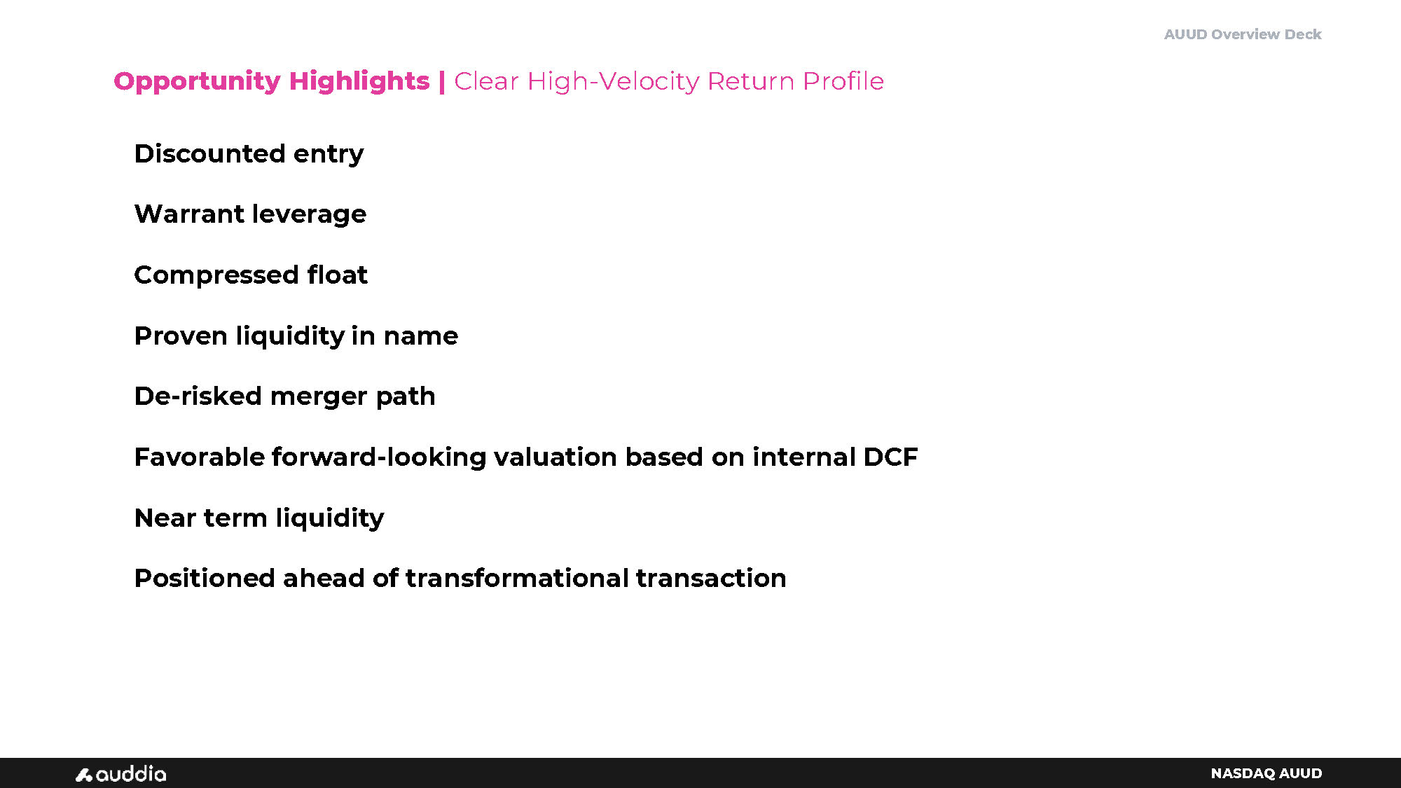 AUUD Overview Deck NASDAQ AUUD Discounted entry Warrant leverage Compressed float Proven liquidity in name De - risked merger path Favorable forward - looking valuation based on internal DCF Near term liquidity Positioned ahead of transformational transaction Opportunity Highlights | Clear High - Velocity Return Profile