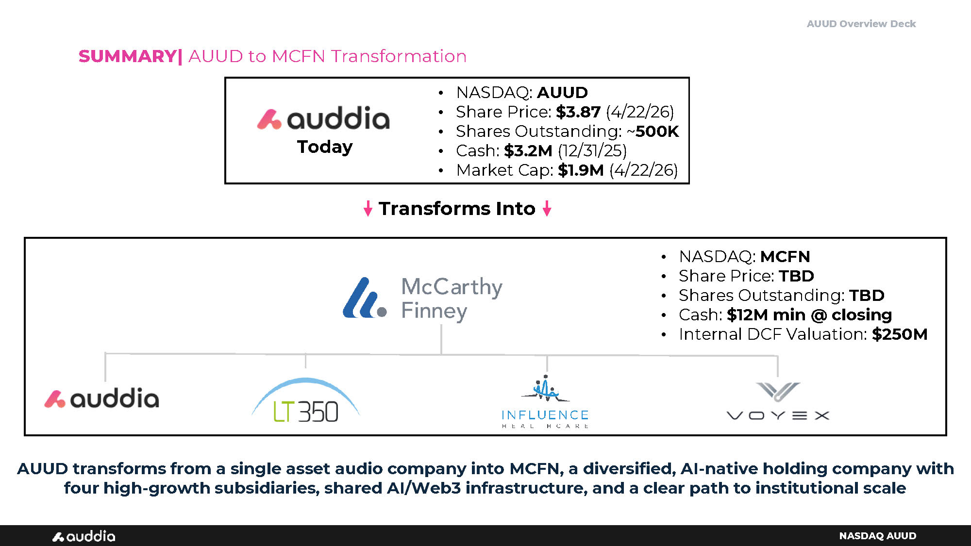 AUUD Overview Deck NASDAQ AUUD • NASDAQ: AUUD • Share Price: $3.87 (4/22/26) • Shares Outstanding: ~ 500K • Cash: $3.2M (12/31/25) • Market Cap: $1.9M (4/22/26) SUMMARY| AUUD to MCFN Transformation AUUD transforms from a single asset audio company into MCFN, a diversified, AI - native holding company with four high - growth subsidiaries, shared AI/Web3 infrastructure, and a clear path to institutional scale Today Transforms Into • NASDAQ: MCFN • Share Price: TBD • Shares Outstanding: TBD • Cash: $12M min @ closing • Internal DCF Valuation: $250M