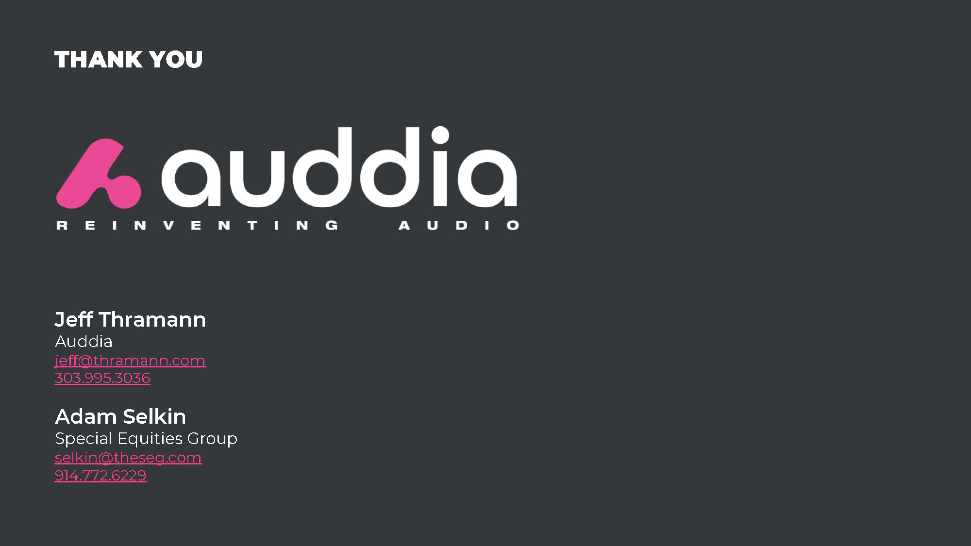 Jeff Thramann Auddia jeff@thramann.com 303.995.3036 Adam Selkin Special Equities Group selkin@theseg.com 914.772.6229 THANK YOU