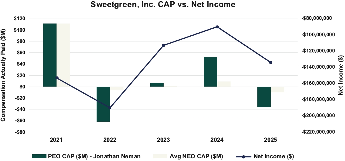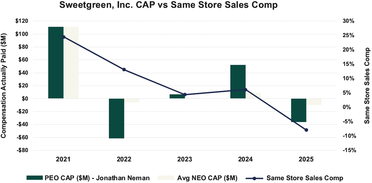 Pay Versus Performance Table The following table sets forth additional compensation information of our Principal Executive Officer (“PEO”) and our non-PEO NEOs, along with total shareholder return (“TSR”), net income, and Same-Store Sales Change performance results, for our fiscal years ending in 2021, 2022, 2023, 2024, and 2025: | | | | | | | | | | | | | | | | | | | | | | | | | 2025 | | | 3,226,081 | | | (36,146,134) (4) | | | 2,925,944 | | | (9,702,306) (4) | | | 25 | | | 87 | | | (134,065,000) | | | (7.9) | | | 2024 | | | 910,550 | | | 52,279,549 (4) | | | 2,173,466 | | | 9,187,848 (4) | | | 116 | | | 103 | | | (90,373,000) | | | 6.2 | | | 2023 | | | 622,548 | | | 6,744,537 (4) | | | 1,080,321 | | | 1,570,321 (4) | | | 40 | | | 89 | | | (113,384,000) | | | 4.4 | | | 2022 | | | 350,144 | | | (61,516,400) (4) | | | 649,693 | | | (5,807,584) (4) | | | 32 | | | 76 | | | (190,441,000) | | | 13.1 | | | 2021 | | | 38,834,483 | | | 111,254,241 (4) | | | 38,814,481 | | | 111,234,239 (4) | | | 112 | | | 98 | | | (153,175,000) | | | 24.6 | | | | | | | | | | | | | | | | | | | | | | | | | | | | |