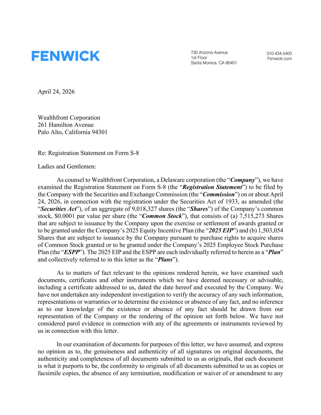 Wealthfront Corporation April 24, 2026 Page 2 document reviewed by us (other than as has been disclosed to us), the legal competence or capacity of all persons or entities (other than the Company) executing the same and (other than the Company) the due authorization, execution and delivery of all documents by each party thereto. We have also assumed the conformity of the documents filed with the Commission via the Electronic Data Gathering, Analysis and Retrieval System (“EDGAR”), except for required EDGAR formatting changes, to physical copies submitted for our examination. The opinions in this letter are limited to the existing General Corporation Law of the State of Delaware now in effect. We express no opinion with respect to any other laws. Based upon, and subject to, the foregoing, it is our opinion that the Shares, when issued and sold by the Company in accordance with the terms (including, without limitation, payment and authorization provisions) of the applicable Plan and the applicable form of award agreement thereunder, against the Company’s receipt of payment therefor (in an amount and type of consideration not less than the par value per Share), and duly registered on the books of the transfer agent and registrar for the Shares in the name or on behalf of the holders thereof, will be validly issued, fully paid and non-assessable. We consent to the use of this opinion as an exhibit to the Registration Statement and further consent to all references to us, if any, in the Registration Statement, the prospectuses constituting a part thereof and any amendments thereto. We do not thereby admit that we are within the category of persons whose consent is required under Section 7 of the Securities Act or the rules and regulations of the Commission thereunder. This opinion is intended solely for your use in connection with the issuance and sale of the Shares subject to the Registration Statement and is not to be relied upon for any other purpose. In providing this letter, we are opining only as to the specific legal issues expressly set forth above, and no opinion shall be inferred as to any other matter or matters. This opinion is rendered on, and speaks only as of, the date of this letter first written above, and does not address any potential change in facts or law that may occur after the date of this opinion letter. We assume no obligation to advise you of any fact, circumstance, event or change in the law or the facts that may hereafter be brought to our attention, whether or not such occurrence would affect or modify any of the opinions expressed herein. Very truly yours, /s/ Fenwick & West LLP FENWICK & WEST LLP