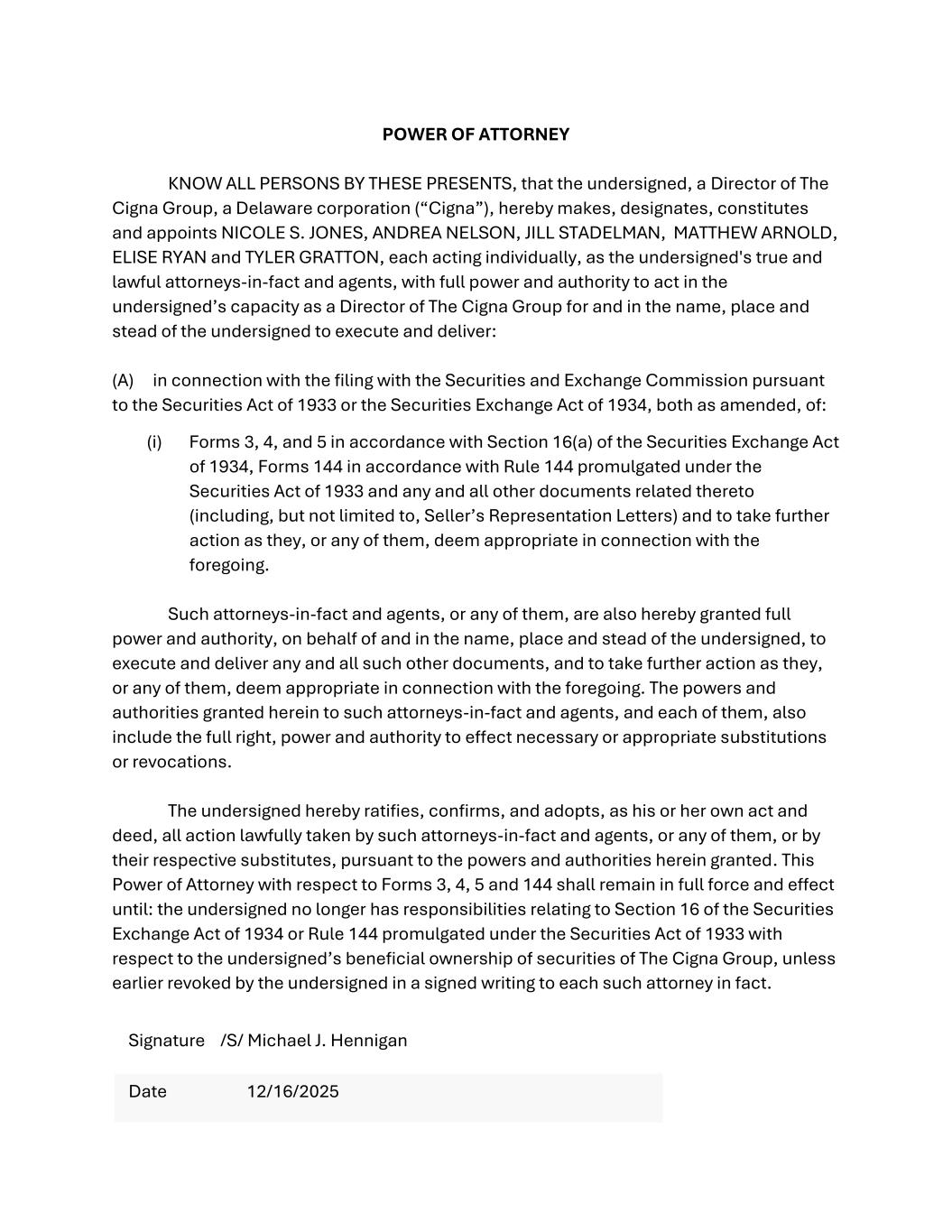 POWER OF ATTORNEY KNOW ALL PERSONS BY THESE PRESENTS, that the undersigned, a Director of The Cigna Group, a Delaware corporation (“Cigna”), hereby makes, designates, constitutes and appoints NICOLE S. JONES, ANDREA NELSON, JILL STADELMAN, MATTHEW ARNOLD, ELISE RYAN and TYLER GRATTON, each acting individually, as the undersigned's true and lawful attorneys-in-fact and agents, with full power and authority to act in the undersigned’s capacity as a Director of The Cigna Group for and in the name, place and stead of the undersigned to execute and deliver: (A) in connection with the filing with the Securities and Exchange Commission pursuant to the Securities Act of 1933 or the Securities Exchange Act of 1934, both as amended, of: (i) Forms 3, 4, and 5 in accordance with Section 16(a) of the Securities Exchange Act of 1934, Forms 144 in accordance with Rule 144 promulgated under the Securities Act of 1933 and any and all other documents related thereto (including, but not limited to, Seller’s Representation Letters) and to take further action as they, or any of them, deem appropriate in connection with the foregoing. Such attorneys-in-fact and agents, or any of them, are also hereby granted full power and authority, on behalf of and in the name, place and stead of the undersigned, to execute and deliver any and all such other documents, and to take further action as they, or any of them, deem appropriate in connection with the foregoing. The powers and authorities granted herein to such attorneys-in-fact and agents, and each of them, also include the full right, power and authority to effect necessary or appropriate substitutions or revocations. The undersigned hereby ratifies, confirms, and adopts, as his or her own act and deed, all action lawfully taken by such attorneys-in-fact and agents, or any of them, or by their respective substitutes, pursuant to the powers and authorities herein granted. This Power of Attorney with respect to Forms 3, 4, 5 and 144 shall remain in full force and effect until: the undersigned no longer has responsibilities relating to Section 16 of the Securities Exchange Act of 1934 or Rule 144 promulgated under the Securities Act of 1933 with respect to the undersigned’s beneficial ownership of securities of The Cigna Group, unless earlier revoked by the undersigned in a signed writing to each such attorney in fact. Signature /S/ Michael J. Hennigan Date 12/16/2025