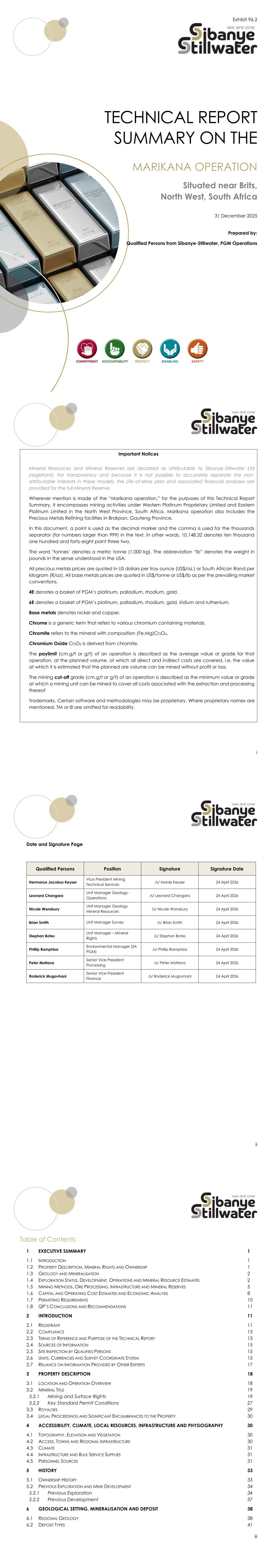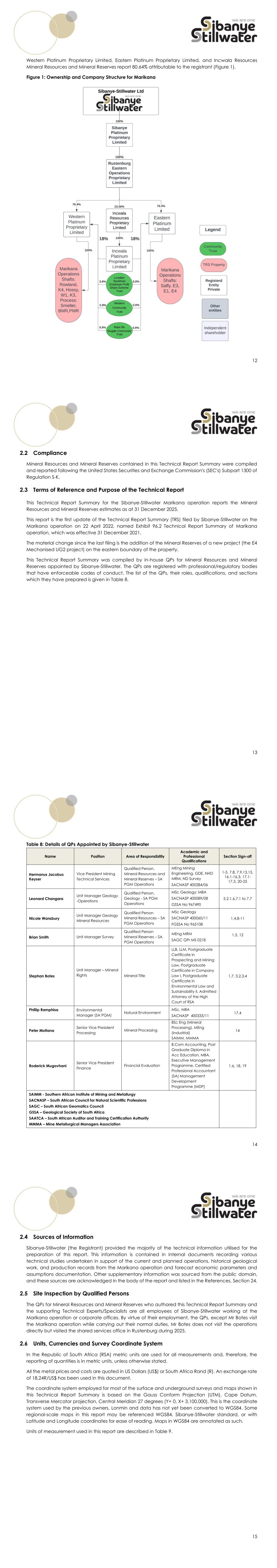 12 Western Platinum Proprietary Limited, Eastern Platinum Proprietary Limited, and Incwala Resources Mineral Resources and Mineral Reserves report 80.64% attributable to the registrant (Figure 1). Figure 1: Ownership and Company Structure for Marikana 13 2.2 Compliance Mineral Resources and Mineral Reserves contained in this Technical Report Summary were compiled and reported following the United States Securities and Exchange Commission's (SEC's) Subpart 1300 of Regulation S-K. 2.3 Terms of Reference and Purpose of the Technical Report This Technical Report Summary for the Sibanye-Stillwater Marikana operation reports the Mineral Resources and Mineral Reserves estimates as at 31 December 2025. This report is the first update of the Technical Report Summary (TRS) filed by Sibanye-Stillwater on the Marikana operation on 22 April 2022, named Exhibit 96.2 Technical Report Summary of Marikana operation, which was effective 31 December 2021. The material change since the last filing is the addition of the Mineral Reserves of a new project (the E4 Mechanised UG2 project) on the eastern boundary of the property. This Technical Report Summary was compiled by in-house QPs for Mineral Resources and Mineral Reserves appointed by Sibanye-Stillwater. The QPs are registered with professional/regulatory bodies that have enforceable codes of conduct. The list of the QPs, their roles, qualifications, and sections which they have prepared is given in Table 8. 14 Table 8: Details of QPs Appointed by Sibanye-Stillwater Name Position Area of Responsibility Academic and Professional Qualifications Section Sign-off Hermanus Jacobus Keyser Vice President Mining Technical Services Qualified Person, Mineral Resources and Mineral Reserves – SA PGM Operations MEng Mining Engineering, GDE, NHD MRM, ND Survey SACNASP 400284/06 1-5, 7.8, 7.9,13,15, 16.1-16.3, 17.1- 17.3, 20-25 Leonard Changara Unit Manager Geology -Operations Qualified Person, Geology - SA PGM Operations MSc Geology; MBA SACNASP 400089/08 GSSA No 967490 5.2.1,6,7.1 to 7.7 Nicole Wansbury Unit Manager Geology Mineral Resources Qualified Person Mineral Resources – SA PGM Operations MSc Geology SACNASP 400060/11 FGSSA No 965108 1.4,8-11 Brian Smith Unit Manager Survey Qualified Person Mineral Reserves – SA PGM Operations MEng MRM SAGC GPr MS 0218 1.5, 12 Stephan Botes Unit Manager – Mineral Rights Mineral Title LLB, LLM, Postgraduate Certificate in Prospecting and Mining Law, Postgraduate Certificate in Company Law I, Postgraduate Certificate in Environmental Law and Sustainability II, Admitted Attorney of the High Court of RSA 1.7, 3.2,3.4 Phillip Ramphisa Environmental Manager (SA PGM) Natural Environment MSc, MBA SACNASP 400333/11 17.4 Peter Motlana Senior Vice President Processing Mineral Processing BSc Eng (Mineral Processing), MEng (Industrial) SAIMM, MMMA 14 Roderick Mugovhani Senior Vice President Finance Financial Evaluation B.Com Accounting, Post Graduate Diploma in Acc Education, MBA, Executive Management Programme, Certified Professional Accountant (SA) Management Development Programme (MDP) 1.6, 18, 19 SAIMM - Southern African Institute of Mining and Metallurgy SACNASP – South African Council for Natural Scientific Professions SAGC – South African Geomatics Council GSSA – Geological Society of South Africa SAATCA – South African Auditor and Training Certification Authority MMMA – Mine Metallurgical Managers Association 15 2.4 Sources of Information Sibanye-Stillwater (the Registrant) provided the majority of the technical information utilised for the preparation of this report. This information is contained in internal documents recording various technical studies undertaken in support of the current and planned operations, historical geological work, and production records from the Marikana operation and forecast economic parameters and assumptions documentation. Other supplementary information was sourced from the public domain, and these sources are acknowledged in the body of the report and listed in the References, Section 24. 2.5 Site Inspection by Qualified Persons The QPs for Mineral Resources and Mineral Reserves who authored this Technical Report Summary and the supporting Technical Experts/Specialists are all employees of Sibanye-Stillwater working at the Marikana operation or corporate offices. By virtue of their employment, the QPs, except Mr Botes visit the Marikana operation while carrying out their normal duties. Mr Botes does not visit the operations directly but visited the shared services office in Rustenburg during 2025. 2.6 Units, Currencies and Survey Coordinate System In the Republic of South Africa (RSA) metric units are used for all measurements and, therefore, the reporting of quantities is in metric units, unless otherwise stated. All the metal prices and costs are quoted in US Dollars (US$) or South Africa Rand (R). An exchange rate of 18.24R/US$ has been used in this document. The coordinate system employed for most of the surface and underground surveys and maps shown in this Technical Report Summary is based on the Gauss Conform Projection (UTM), Cape Datum, Transverse Mercator projection, Central Meridian 27 degrees (Y+ 0, X+ 3,100,000). This is the coordinate system used by the previous owners, Lonmin and data has not yet been converted to WGS84. Some regional-scale maps in this report may be referenced WGS84, Sibanye-Stillwater standard, or with Latitude and Longitude coordinates for ease of reading. Maps in WGS84 are annotated as such. Units of measurement used in this report are described in Table 9.