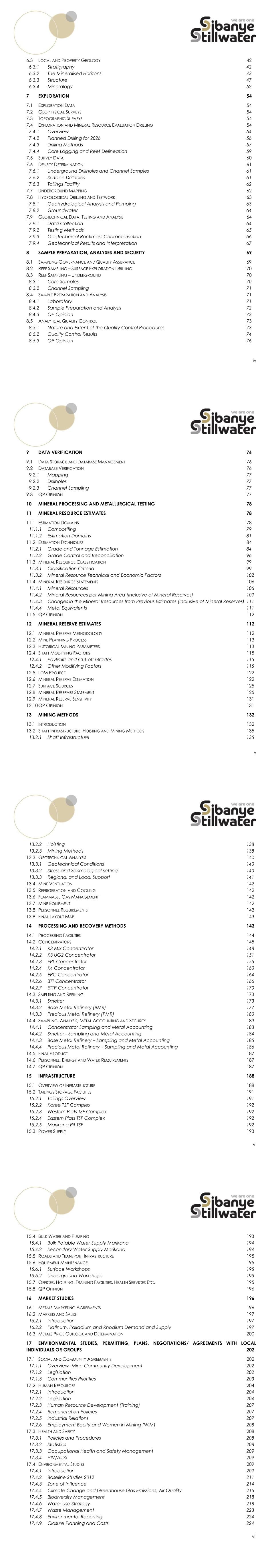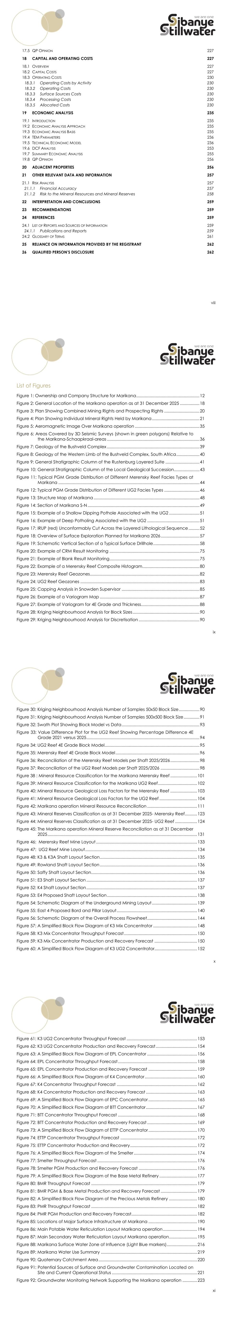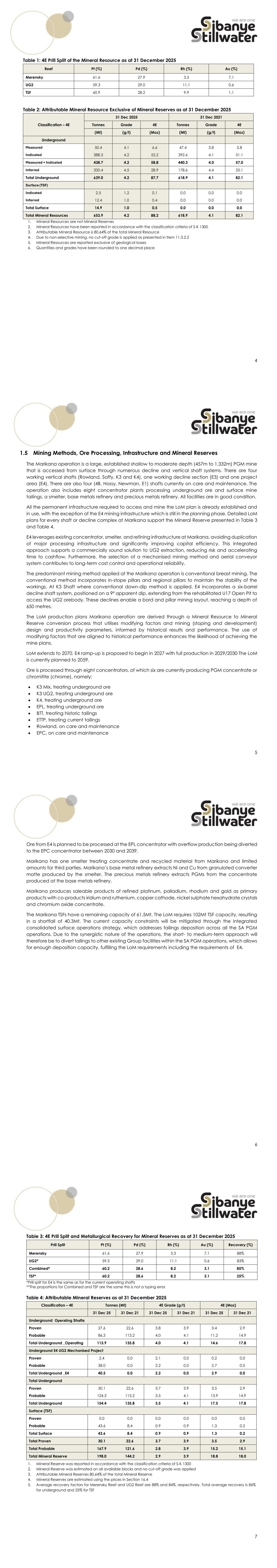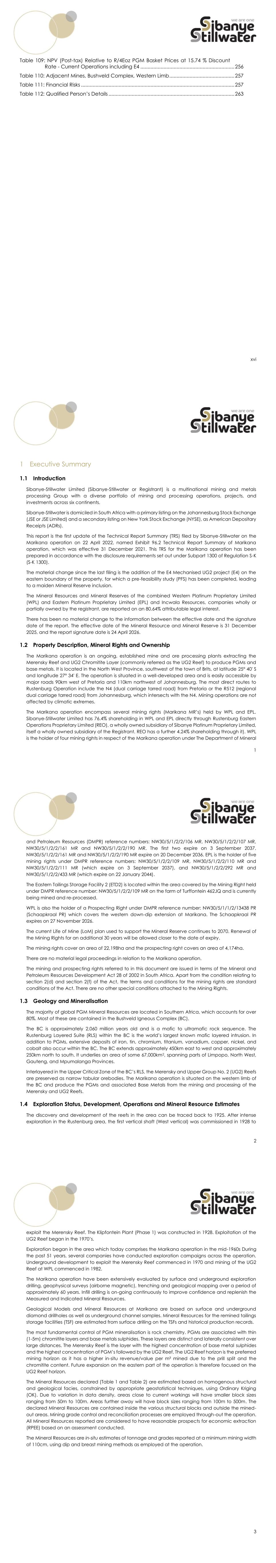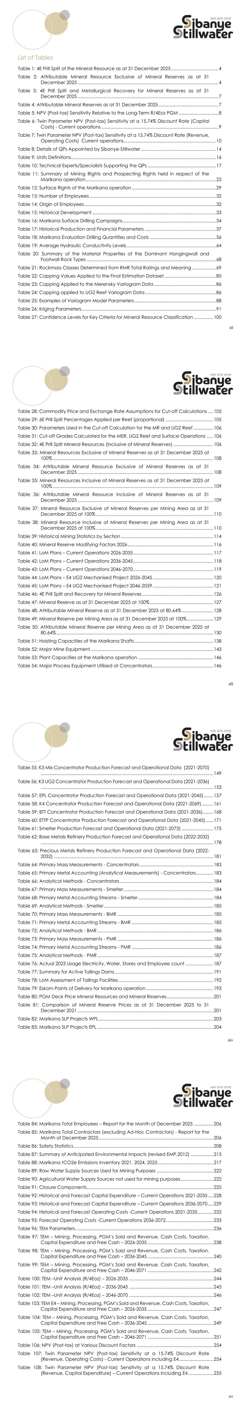 xii List of Tables Table 1: 4E Prill Split of the Mineral Resource as at 31 December 2025 .................................... 4 Table 2: Attributable Mineral Resource Exclusive of Mineral Reserves as at 31 December 2025 ........................................................................................................... 4 Table 3: 4E Prill Split and Metallurgical Recovery for Mineral Reserves as at 31 December 2025 ........................................................................................................... 7 Table 4: Attributable Mineral Reserves as at 31 December 2025 .............................................. 7 Table 5: NPV (Post-tax) Sensitivity Relative to the Long-Term R/4Eoz PGM .............................. 8 Table 6: Twin Parameter NPV (Post-tax) Sensitivity at a 15.74% Discount Rate (Capital Costs) - Current operations ......................................................................................... 9 Table 7: Twin Parameter NPV (Post-tax) Sensitivity at a 15.74% Discount Rate (Revenue, Operating Costs) Current operations ...................................................................... 10 Table 8: Details of QPs Appointed by Sibanye-Stillwater ......................................................... 14 Table 9: Units Definitions .............................................................................................................. 16 Table 10: Technical Experts/Specialists Supporting the QPs .................................................... 17 Table 11: Summary of Mining Rights and Prospecting Rights held in respect of the Marikana operation ................................................................................................... 22 Table 12: Surface Rights of the Marikana operation ................................................................ 29 Table 13: Number of Employees ................................................................................................ 32 Table 14: Origin of Employees .................................................................................................... 32 Table 15: Historical Development .............................................................................................. 33 Table 16: Marikana Surface Drilling Campaigns ....................................................................... 34 Table 17: Historical Production and Financial Parameters ...................................................... 37 Table 18: Marikana Evaluation Drilling Quantities and Costs .................................................. 56 Table 19: Average Hydraulic Conductivity Levels .................................................................... 64 Table 20: Summary of the Material Properties of the Dominant Hangingwall and Footwall Rock Types .................................................................................................. 68 Table 21: Rockmass Classes Determined from RMR Total Ratings and Meaning .................. 69 Table 22: Capping Values Applied to the Final Estimation Dataset ....................................... 85 Table 23: Capping Applied to the Merensky Variogram Data ............................................... 86 Table 24: Capping applied to UG2 Reef Variogram Data ...................................................... 86 Table 25: Examples of Variogram Model Parameters .............................................................. 88 Table 26: Kriging Parameters ...................................................................................................... 91 Table 27: Confidence Levels for Key Criteria for Mineral Resource Classification ............... 100 xiii Table 28: Commodity Price and Exchange Rate Assumptions for Cut-off Calculations .... 105 Table 29: 6E Prill Split Percentages Applied per Reef (proportional) .................................... 105 Table 30: Parameters Used in the Cut-off Calculation for the MR and UG2 Reef ............... 106 Table 31: Cut-off Grades Calculated for the MER, UG2 Reef and Surface Operations ..... 106 Table 32: 4E Prill Split Mineral Resources (Inclusive of Mineral Reserves) .............................. 106 Table 33: Mineral Resources Exclusive of Mineral Reserves as at 31 December 2025 at 100% .......................................................................................................................... 108 Table 34: Attributable Mineral Resource Exclusive of Mineral Reserves as at 31 December 2025 ....................................................................................................... 108 Table 35: Mineral Resources Inclusive of Mineral Reserves as at 31 December 2025 at 100% .......................................................................................................................... 109 Table 36: Attributable Mineral Resource Inclusive of Mineral Reserves as at 31 December 2025 ....................................................................................................... 109 Table 37: Mineral Resource Exclusive of Mineral Reserves per Mining Area as at 31 December 2025 at 100% ......................................................................................... 110 Table 38: Mineral Resource Inclusive of Mineral Reserves per Mining Area as at 31 December 2025 at 100% ......................................................................................... 110 Table 39: Historical Mining Statistics by Section ...................................................................... 114 Table 40: Mineral Reserve Modifying Factors 2026 ................................................................. 116 Table 41: LoM Plans – Current Operations 2026-2035 ............................................................. 117 Table 42: LoM Plans – Current Operations 2036-2045 ............................................................. 118 Table 43: LoM Plans – Current Operations 2046-2070 ............................................