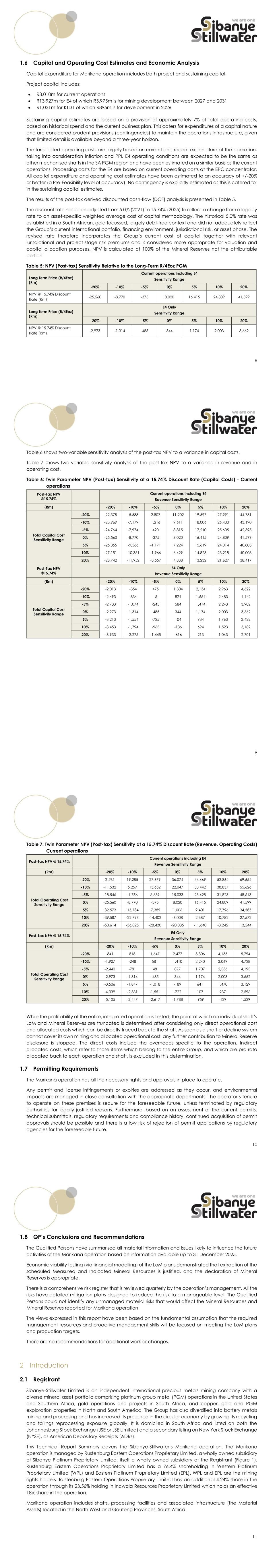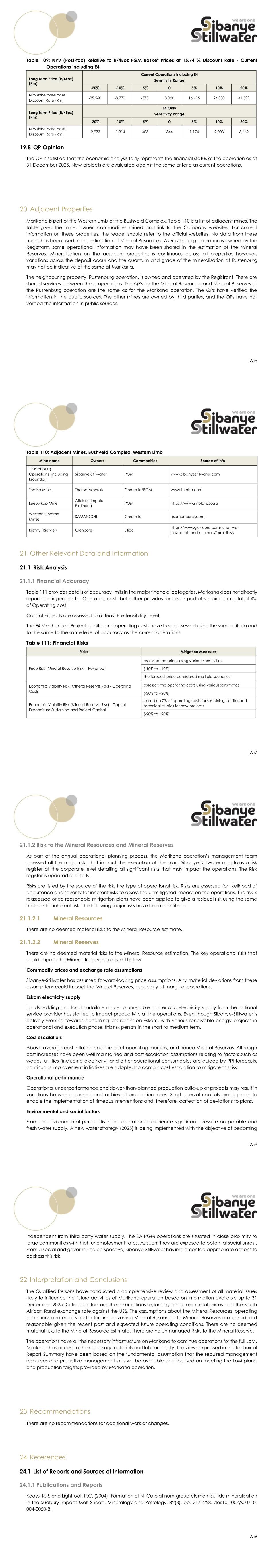 256 Table 109: NPV (Post-tax) Relative to R/4Eoz PGM Basket Prices at 15.74 % Discount Rate - Current Operations including E4 Long Term Price (R/4Eoz) (Rm) Current Operations including E4 Sensitivity Range -20% -10% -5% 0 5% 10% 20% NPV@the base case Discount Rate (Rm) -25,560 -8,770 -375 8,020 16,415 24,809 41,599 Long Term Price (R/4Eoz) (Rm) E4 Only Sensitivity Range -20% -10% -5% 0 5% 10% 20% NPV@the base case Discount Rate (Rm) -2,973 -1,314 -485 344 1,174 2,003 3,662 19.8 QP Opinion The QP is satisfied that the economic analysis fairly represents the financial status of the operation as at 31 December 2025. New projects are evaluated against the same criteria as current operations. 20 Adjacent Properties Marikana is part of the Western Limb of the Bushveld Complex. Table 110 is a list of adjacent mines. The table gives the mine, owner, commodities mined and link to the Company websites. For current information on these properties, the reader should refer to the official websites. No data from these mines has been used in the estimation of Mineral Resources. As Rustenburg operation is owned by the Registrant, some operational information may have been shared in the estimation of the Mineral Reserves. Mineralisation on the adjacent properties is continuous across all properties however, variations across the deposit occur and the quantum and grade of the mineralisation at Rustenburg may not be indicative of the same at Marikana. The neighbouring property, Rustenburg operation, is owned and operated by the Registrant. There are shared services between these operations. The QPs for the Mineral Resources and Mineral Reserves of the Rustenburg operation are the same as for the Marikana operation. The QPs have verified the information in the public sources. The other mines are owned by third parties, and the QPs have not verified the information in public sources. 257 Table 110: Adjacent Mines, Bushveld Complex, Western Limb Mine name Owners Commodities Source of info *Rustenburg Operations (including Kroondal) Sibanye-Stillwater PGM www.sibanyestillwater.com Tharisa Mine Tharisa Minerals Chromite/PGM www.tharisa.com Leeuwkop Mine Aflplats (Impala Platinum) PGM https://www.implats.co.za Western Chrome Mines SAMANCOR Chromite (samancorcr.com) Rietvly (Rietvlei) Glencore Silica https://www.glencore.com/what-we- do/metals-and-minerals/ferroalloys 21 Other Relevant Data and Information 21.1 Risk Analysis 21.1.1 Financial Accuracy Table 111 provides details of accuracy limits in the major financial categories. Marikana does not directly report contingencies for Operating costs but rather provides for this as part of sustaining capital at 4% of Operating cost. Capital Projects are assessed to at least Pre-feasibility Level. The E4 Mechanised Project capital and operating costs have been assessed using the same criteria and to the same to the same level of accuracy as the current operations. Table 111: Financial Risks Risks Mitigation Measures Price Risk (Mineral Reserve Risk) - Revenue assessed the prices using various sensitivities (-10% to +10%) the forecast price considered multiple scenarios Economic Viability Risk (Mineral Reserve Risk) - Operating Costs assessed the operating costs using various sensitivities (-20% to +20%) Economic Viability Risk (Mineral Reserve Risk) - Capital Expenditure Sustaining and Project Capital based on 7% of operating costs for sustaining capital and technical studies for new projects (-20% to +20%) 258 21.1.2 Risk to the Mineral Resources and Mineral Reserves As part of the annual operational planning process, the Marikana operation’s management team assessed all the major risks that impact the execution of the plan. Sibanye-Stillwater maintains a risk register at the corporate level detailing all significant risks that may impact the operations. The Risk register is updated quarterly. Risks are listed by the source of the risk, the type of operational risk. Risks are assessed for likelihood of occurrence and severity for inherent risks to assess the unmitigated impact on the operations. The risk is reassessed once reasonable mitigation plans have been applied to give a residual risk using the same scale as for inherent risk. The following major risks have been identified. 21.1.2.1 Mineral Resources There are no deemed material risks to the Mineral Resource estimate. 21.1.2.2 Mineral Reserves There are no deemed material risks to the Mineral Resource estimation. The key operational risks that could impact the Mineral Reserves are listed below. Commodity prices and exchange rate assumptions Sibanye-Stillwater has assumed forward-looking price assumptions. Any material deviations from these assumptions could impact the Mineral Reserves, especially at marginal operations. Eskom electricity supply Loadshedding and load curtailment due to unreliable and erratic electricity supply from the national service provider has started to impact productivity at the operations. Even though Sibanye-Stillwater is actively working towards becoming less reliant on Eskom, with various renewable energy projects in operational and execution phase, this risk persists in the short to medium term. Cost escalation: Above average cost inflation could impact operating margins, and hence Mineral Reserves. Although cost increases have been well maintained and cost escalation assumptions relating to factors such as wages, utilities (including electricity) and other operational consumables are guided by PPI forecasts, continuous improvement initiatives are adopted to contain cost escalation to mitigate this risk. Operational performance Operational underperformance and slower-than-planned production build-up at projects may result in variations between planned and achieved production rates. Short interval controls are in place to enable the implementation of timeous interventions and, therefore, correction of deviations to plans. Environmental and social factors From an environmental persp