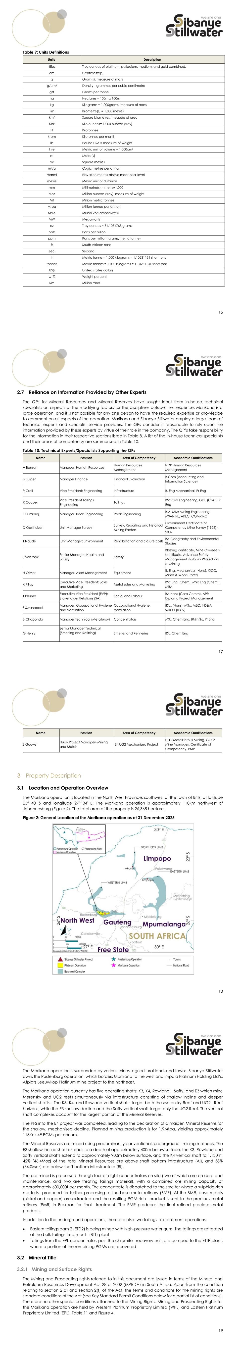 16 Table 9: Units Definitions Units Description 4Eoz Troy ounces of platinum, palladium, rhodium, and gold combined. cm Centimetre(s) g Gram(s), measure of mass g/cm3 Density - grammes per cubic centimetre g/t Grams per tonne ha Hectares = 100m x 100m kg Kilograms = 1,000grams, measure of mass km Kilometre(s) = 1,000 metres km2 Square kilometres, measure of area Koz Kilo ounces= 1,000 ounces (troy) kt Kilotonnes ktpm Kilotonnes per month lb Pound USA = measure of weight litre Metric unit of volume = 1,000cm3 m Metre(s) m2 Square metres m3/a Cubic metres per annum mamsl Elevation metres above mean seal level metre Metric unit of distance mm Millimetre(s) = metre/1,000 Moz Million ounces (troy), measure of weight Mt Million metric tonnes Mtpa Million tonnes per annum MVA Million volt-amps(watts) MW Megawatts oz Troy ounces = 31.1034768 grams ppb Parts per billion ppm Parts per million (grams/metric tonne) R South African rand sec Second t Metric tonne = 1,000 kilograms = 1.10231131 short tons tonnes Metric tonnes = 1,000 kilograms = 1.10231131 short tons US$ United states dollars wt% Weight percent Rm Million rand 17 2.7 Reliance on Information Provided by Other Experts The QPs for Mineral Resources and Mineral Reserves have sought input from in-house technical specialists on aspects of the modifying factors for the disciplines outside their expertise. Marikana is a large operation, and it is not possible for any one person to have the required expertise or knowledge to comment on all aspects of the operation. Marikana and Sibanye-Stillwater employ a large team of technical experts and specialist service providers. The QPs consider it reasonable to rely upon the information provided by these experts by virtue of their role in the company. The QP’s take responsibility for the information in their respective sections listed in Table 8. A list of the in-house technical specialists and their areas of competency are summarised in Table 10. Table 10: Technical Experts/Specialists Supporting the QPs Name Position Area of Competency Academic Qualifications A Benson Manager: Human Resources Human Resources Management NDP Human Resources Management B Burger Manager Finance Financial Evaluation B.Com (Accounting and Information Science) R Craill Vice President: Engineering Infrastructure B. Eng Mechanical, Pr Eng R Cooper Vice President Tailings Engineering Tailings BSc Civil Engineering, GDE (Civil), Pr Eng S Durapraj Manager: Rock Engineering Rock Engineering B.A, MSc Mining Engineering, MSANIRE, AREC, COMRMC D Oosthuizen Unit Manager Survey Survey, Reporting and Historical Mining Factors Government Certificate of Competency Mine Survey (1926) - 2009 T Naude Unit Manager: Environment Rehabilitation and closure costs BA Geography and Environmental Studies J van Wyk Senior Manager: Health and Safety Safety Blasting certificate, Mine Overseers certificate, Advance Safety Management diploma Wits school of Mining H Olivier Manager: Asset Management Equipment B. Eng. Mechanical (Hons), GCC: Mines & Works (5999) K Pillay Executive Vice President: Sales and Marketing Metal sales and Marketing BSc Eng (Chem), MSc Eng (Chem), MBA T Phumo Executive Vice President (EVP): Stakeholder Relations (SA) Social and Labour BA Hons (Corp Comm), APR Diploma Project Management S Swanepoel Manager: Occupational Hygiene and Ventilation Occupational Hygiene, Ventilation BSc. (Hons), MSc, MEC, NDSM, SAIOH (0309) B Chaponda Manager Technical (Metallurgy) Concentrators MSc Chem Eng, BMin Sc, Pr Eng G Henry Senior Manager Technical (Smelting and Refining) Smelter and Refineries BSc Chem Eng 18 Name Position Area of Competency Academic Qualifications S Gouws Fluor- Project Manager- Mining and Metals E4 UG2 Mechanised Project NHD Metalliferous Mining, GCC: Mine Managers Certificate of Competency, PMP 3 Property Description 3.1 Location and Operation Overview The Marikana operation is located in the North West Province, southwest of the town of Brits, at latitude 25° 40' S and longitude 27° 34' E. The Marikana operation is approximately 110km northwest of Johannesburg (Figure 2). The total area of the property is 26,365 hectares. Figure 2: General Location of the Marikana operation as at 31 December 2025 19 The Marikana operation is surrounded by various mines, agricultural land, and towns. Sibanye-Stillwater owns the Rustenburg operation, which borders Marikana to the west and Impala Platinum Holding Ltd’s, Afplats Leeuwkop Platinum mine project to the northeast. The Marikana operation currently has five operating shafts: K3, K4, Rowland,