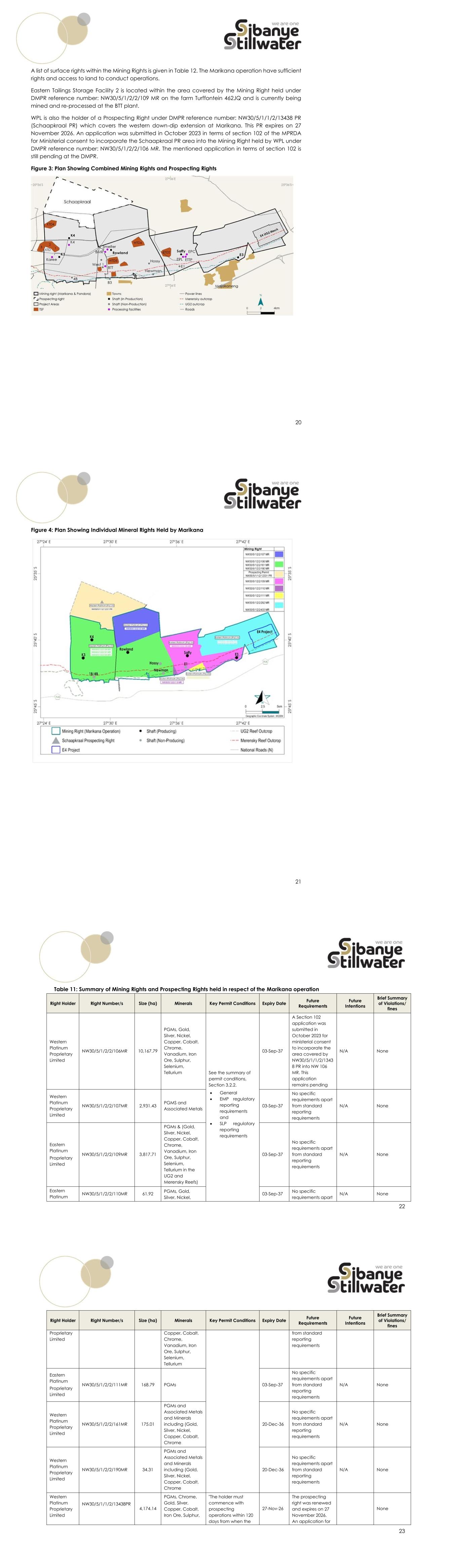 20 A list of surface rights within the Mining Rights is given in Table 12. The Marikana operation have sufficient rights and access to land to conduct operations. Eastern Tailings Storage Facility 2 is located within the area covered by the Mining Right held under DMPR reference number: NW30/5/1/2/2/109 MR on the farm Turffontein 462JQ and is currently being mined and re-processed at the BTT plant. WPL is also the holder of a Prospecting Right under DMPR reference number: NW30/5/1/1/2/13438 PR (Schaapkraal PR) which covers the western down-dip extension at Marikana. This PR expires on 27 November 2026. An application was submitted in October 2023 in terms of section 102 of the MPRDA for Ministerial consent to incorporate the Schaapkraal PR area into the Mining Right held by WPL under DMPR reference number: NW30/5/1/2/2/106 MR. The mentioned application in terms of section 102 is still pending at the DMPR. Figure 3: Plan Showing Combined Mining Rights and Prospecting Rights 21 Figure 4: Plan Showing Individual Mineral Rights Held by Marikana 22 Table 11: Summary of Mining Rights and Prospecting Rights held in respect of the Marikana operation Right Holder Right Number/s Size (ha) Minerals Key Permit Conditions Expiry Date Future Requirements Future Intentions Brief Summary of Violations/ fines Western Platinum Proprietary Limited NW30/5/1/2/2/106MR 10,167.79 PGMs, Gold, Silver, Nickel, Copper, Cobalt, Chrome, Vanadium, Iron Ore, Sulphur, Selenium, Tellurium See the summary of permit conditions, Section 3.2.2. • General • EMP regulatory reporting requirements and • SLP regulatory reporting requirements 03-Sep-37 A Section 102 application was submitted in October 2023 for ministerial consent to incorporate the area covered by NW30/5/1/1/2/1343 8 PR into NW 106 MR. This application remains pending N/A None Western Platinum Proprietary Limited NW30/5/1/2/2/107MR 2,931.43 PGMS and Associated Metals 03-Sep-37 No specific requirements apart from standard reporting requirements N/A None Eastern Platinum Proprietary Limited NW30/5/1/2/2/109MR 3,817.71 PGMs & (Gold, Silver, Nickel, Copper, Cobalt, Chrome, Vanadium, Iron Ore, Sulphur, Selenium, Tellurium in the UG2 and Merensky Reefs) 03-Sep-37 No specific requirements apart from standard reporting requirements N/A None Eastern Platinum NW30/5/1/2/2/110MR 61.92 PGMs, Gold, Silver, Nickel, 03-Sep-37 No specific requirements apart N/A None 23 Right Holder Right Number/s Size (ha) Minerals Key Permit Conditions Expiry Date Future Requirements Future Intentions Brief Summary of Violations/ fines Proprietary Limited Copper, Cobalt, Chrome, Vanadium, Iron Ore, Sulphur, Selenium, Tellurium from standard reporting requirements Eastern Platinum Proprietary Limited NW30/5/1/2/2/111MR 168.79 PGMs 03-Sep-37 No specific requirements apart from standard reporting requirements N/A None Western Platinum Proprietary Limited NW30/5/1/2/2/161MR 175.01 PGMs and Associated Metals and Minerals including (Gold, Silver, Nickel, Copper, Cobalt, Chrome 20-Dec-36 No specific requirements apart from standard reporting requirements N/A None Western Platinum Proprietary Limited NW30/5/1/2/2/190MR 34.31 PGMs and Associated Metals and Minerals including (Gold, Silver, Nickel, Copper, Cobalt, Chrome 20-Dec-36 No specific requirements apart from standard reporting requirements N/A None Western Platinum Proprietary Limited NW30/5/1/1/2/13438PR 4,174.14 PGMs, Chrome, Gold, Silver, Copper, Cobalt, Iron Ore, Sulphur, "The holder must commence with prospecting operations within 120 days from when the 27-Nov-26 The prospecting right was renewed and expires on 27 November 2026. An application for None