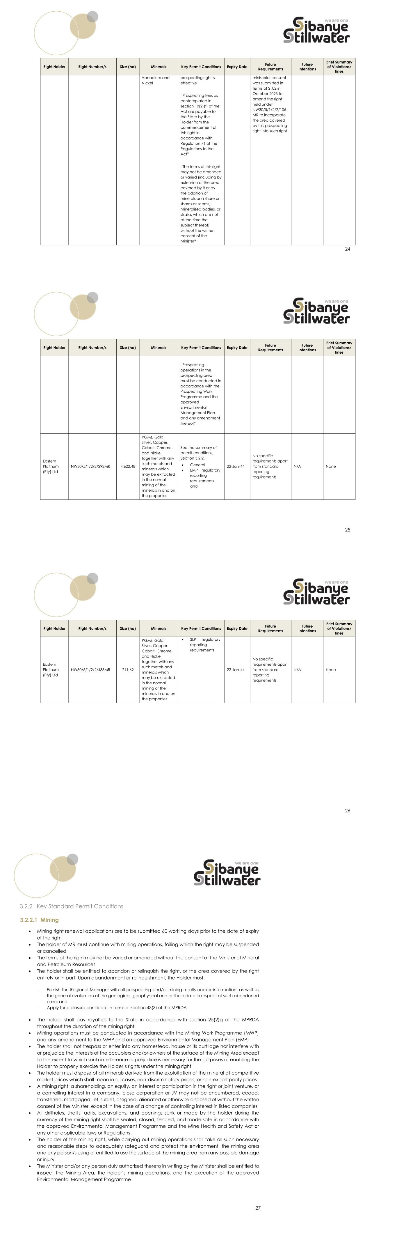 24 Right Holder Right Number/s Size (ha) Minerals Key Permit Conditions Expiry Date Future Requirements Future Intentions Brief Summary of Violations/ fines Vanadium and Nickel prospecting right is effective “Prospecting fees as contemplated in section 19(2)(f) of the Act are payable to the State by the Holder from the commencement of this right in accordance with Regulation 76 of the Regulations to the Act” “The terms of this right may not be amended or varied (including by extension of the area covered by it or by the addition of minerals or a share or shares or seams, mineralised bodies, or strata, which are not at the time the subject thereof) without the written consent of the Minister“ ministerial consent was submitted in terms of S102 in October 2023 to amend the right held under NW30/5/1/2/2/106 MR to incorporate the area covered by this prospecting right into such right 25 Right Holder Right Number/s Size (ha) Minerals Key Permit Conditions Expiry Date Future Requirements Future Intentions Brief Summary of Violations/ fines “Prospecting operations in the prospecting area must be conducted in accordance with the Prospecting Work Programme and the approved Environmental Management Plan and any amendment thereof” Eastern Platinum (Pty) Ltd NW30/5/1/2/2/292MR 4,622.48 PGMs, Gold, Silver, Copper, Cobalt, Chrome, and Nickel together with any such metals and minerals which may be extracted in the normal mining of the minerals in and on the properties See the summary of permit conditions, Section 3.2.2. • General • EMP regulatory reporting requirements and 22-Jan-44 No specific requirements apart from standard reporting requirements N/A None 26 Right Holder Right Number/s Size (ha) Minerals Key Permit Conditions Expiry Date Future Requirements Future Intentions Brief Summary of Violations/ fines Eastern Platinum (Pty) Ltd NW30/5/1/2/2/433MR 211.62 PGMs, Gold, Silver, Copper, Cobalt, Chrome, and Nickel together with any such metals and minerals which may be extracted in the normal mining of the minerals in and on the properties • SLP regulatory reporting requirements 22-Jan-44 No specific requirements apart from standard reporting requirements N/A None 27 3.2.2 Key Standard Permit Conditions 3.2.2.1 Mining • Mining right renewal applications are to be submitted 60 working days prior to the date of expiry of the right • The holder of MR must continue with mining operations, failing which the right may be suspended or cancelled • The terms of the right may not be varied or amended without the consent of the Minister of Mineral and Petroleum Resources • The holder shall be entitled to abandon or relinquish the right, or the area covered by the right entirely or in part. Upon abandonment or relinquishment, the Holder must: - Furnish the Regional Manager with all prospecting and/or mining results and/or information, as well as the general evaluation of the geological, geophysical and drillhole data in respect of such abandoned area; and - Apply for a closure certificate in terms of section 43(3) of the MPRDA • The holder shall pay royalties to the State in accordance with section 25(2)g of the MPRDA throughout the duration of the mining right • Mining operations must be conducted in accordance with the Mining Work Programme (MWP) and any amendment to the MWP and an approved Environmental Management Plan (EMP) • The holder shall not trespass or enter into any homestead, house or its curtilage nor interfere with or prejudice the interests of the occupiers and/or owners of the surface of the Mining Area except to the extent to which such interference or prejudice is necessary for the purposes of enabling the Holder to properly exercise the Holder’s rights under the mining right • The holder must dispose of all minerals derived from the exploitation of the mineral at competitive market prices which shall mean in all cases, non-discriminatory prices, or non-export parity prices • A mining right, a shareholding, an equity, an interest or participation in the right or joint venture, or a controlling interest in a company, close corporation or JV may not be encumbered, ceded, transferred, mortgaged, let, sublet, assigned, alienated or otherwise disposed of without the written consent of the Minister, except in the case of a change of controlling interest in listed companies • All drillholes, shafts, adits, excavations, and openings sunk or made by the holder during the currency of the mining right shall be sealed, closed, fenced, and made safe in accordance with the approved Environmental Management Programme and the Mine Health and Safety Act or any other applicable laws or Regulations • The holder of the mining right, while carrying out mining operations shall take all such necessary and reasonable steps to adequately safeguard and protect the environment, the mining area and any person/s using or entitled to use the surface of the mining area from any possible damage or injury • The Minister and/or any person duly authorised thereto in writing by the Minister shall be entitled to inspect the Mining Area, the holder’s mining operations, and the execution of the approved Environmental Management Programme