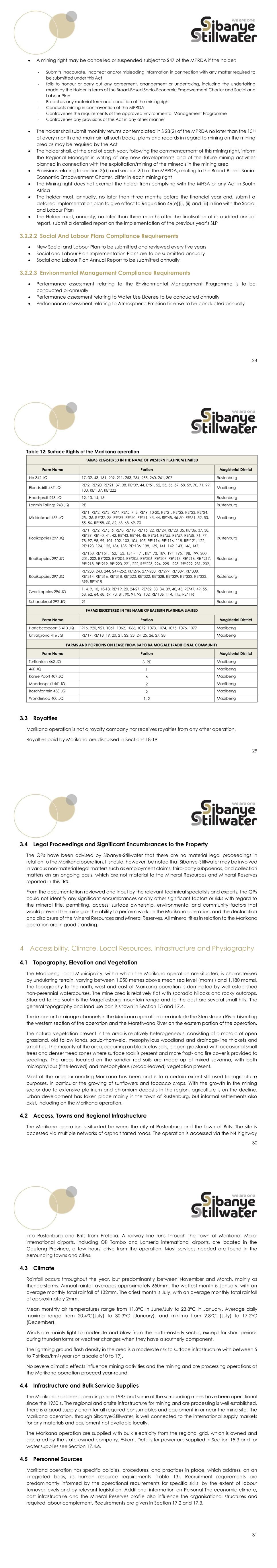 28 • A mining right may be cancelled or suspended subject to S47 of the MPRDA if the holder: - Submits inaccurate, incorrect and/or misleading information in connection with any matter required to be submitted under this Act - fails to honour or carry out any agreement, arrangement or undertaking, including the undertaking made by the Holder in terms of the Broad-Based Socio-Economic Empowerment Charter and Social and Labour Plan - Breaches any material term and condition of the mining right - Conducts mining in contravention of the MPRDA - Contravenes the requirements of the approved Environmental Management Programme - Contravenes any provisions of this Act in any other manner • The holder shall submit monthly returns contemplated in S 28(2) of the MPRDA no later than the 15th of every month and maintain all such books, plans and records in regard to mining on the mining area as may be required by the Act • The holder shall, at the end of each year, following the commencement of this mining right, inform the Regional Manager in writing of any new developments and of the future mining activities planned in connection with the exploitation/mining of the minerals in the mining area • Provisions relating to section 2(d) and section 2(f) of the MPRDA, relating to the Broad-Based Socio- Economic Empowerment Charter, differ in each mining right • The Mining right does not exempt the holder from complying with the MHSA or any Act in South Africa • The holder must, annually, no later than three months before the financial year end, submit a detailed implementation plan to give effect to Regulation 46(e)(i), (ii) and (iii) in line with the Social and Labour Plan • The Holder must, annually, no later than three months after the finalisation of its audited annual report, submit a detailed report on the implementation of the previous year’s SLP 3.2.2.2 Social And Labour Plans Compliance Requirements • New Social and Labour Plan to be submitted and reviewed every five years • Social and Labour Plan Implementation Plans are to be submitted annually • Social and Labour Plan Annual Report to be submitted annually 3.2.2.3 Environmental Management Compliance Requirements • Performance assessment relating to the Environmental Management Programme is to be conducted bi-annually • Performance assessment relating to Water Use License to be conducted annually • Performance assessment relating to Atmospheric Emission License to be conducted annually 29 Table 12: Surface Rights of the Marikana operation FARMS REGISTERED IN THE NAME OF WESTERN PLATINUM LIMITED Farm Name Portion Magisterial District No 342 JQ 17, 32, 43, 151, 209, 211, 253, 254, 255, 260, 261, 307 Rustenburg Elandsdrift 467 JQ RE*2, RE*20, RE*21, 37, 38, RE*39, 44, E*51, 52, 53, 56, 57, 58, 59, 70, 71, 99, 100, RE*137, RE*222 Madibeng Hoedspruit 298 JQ 12, 13, 14, 16 Rustenburg Lonmin Tailings 943 JQ RE Rustenburg Middelkraal 466 JQ RE*1, RE*2, RE*3, RE*4, RE*5, 7, 8, RE*9, 10-20, RE*21, RE*22, RE*23, RE*24, 25, -36, RE*37, 38, RE*39, RE*40, RE*41, 43, 44, RE*45, 46-50, RE*51, 52, 53, 55, 56, RE*58, 60, 62, 63, 68, 69, 70 Madibeng Rooikoppies 297 JQ RE*1, RE*2, RE*5, 6, RE*8, RE*10, RE*16, 22, RE*24, RE*28, 35, RE*36, 37, 38, RE*39, RE*40, 41, 42, RE*43, RE*44, 48, RE*54, RE*55, RE*57, RE*58, 76, 77, 78, 97, 98, 99, 101, 102, 103, 104, 105, RE*114, RE*116, 118, RE*121, 122, RE*123, 124, 125, 134, 135, RE*136, 138, 139, 141, 142, 143, 146, 147, Rustenburg Rooikoppies 297 JQ RE*150, RE*151, 152, 153, 154 - 171, RE*173, 189, 194, 195, 198, 199, 200, 201, 202, RE*203, RE*204, RE*205, RE*206, RE*207, RE*213, RE*216, RE *217, RE*218, RE*219, RE*220, 221, 222, RE*223, 224, 225 - 228, RE*229, 231, 232, Rustenburg Rooikoppies 297 JQ RE*233, 243, 244, 247-252, RE*276, 277-283, RE*297, RE*307, RE*308, RE*314, RE*316, RE*318, RE*320, RE*322, RE*328, RE*329, RE*332, RE*333, 399, RE*415 Rustenburg Zwartkoppies 296 JQ 1, 4, 9, 10, 13-18, RE*19, 20, 24-27, RE*32, 33, 34, 39, 40, 45, RE*47, 49, 55, 58, 62, 64, 68, 69, 73, 81, 90, 91, 92, 102, RE*106, 114, 115, RE*116 Rustenburg Schaapkraal 292 JQ 21 Rustenburg FARMS REGISTERED IN THE NAME OF EASTERN PLATINUM LIMITED Farm Name Portion Magisterial District Hartebeespoort B 410 JQ 916, 920, 921, 1061, 1062, 1066, 1072, 1073, 1074, 1075, 1076, 1077 Madibeng Uitvalgrond 416 JQ RE*17, RE*18, 19, 20, 21, 22, 23, 24, 25, 26, 27, 28 Madibeng FARMS AND PORTIONS ON LEASE FROM BAPO BA MOGALE TRADITIONAL COMMUNITY Farm Name Portion Magisterial District Turffontein 462 JQ 3, RE Madibeng 460 JQ 1 Madibeng Karee Poort 407 JQ 6 Madibeng Modderspruit 461JQ 2 Madibeng Boschfontein 458 JQ 5 Madibeng Wonderkop 400 JQ 1, 2 Madibeng 3.3 Royalties Marikana operation is not a royalty company nor receives royalties from any other operation. Royalties paid by Marikana are discussed in Sections 18-19. 30 3.4 Legal Proceedings and Significant Encumbrances to the Property The QPs have been advised by Sibanye-Stillwater that there are no material legal proceedings in relation to the Marikana operation. It should, however, be noted that Sibanye-Stillwater may be involved in various non-material legal matters such as employment claims, third-party subpoenas, and collection matters on an ongoing basis, which are not material to the Mineral Resources and Mineral Reserves reported in this TRS. From the documentation reviewed and input by the relevant technical specialists and experts, the QPs could not identify any significant encumbrances or any other significant factors or risks with regard to the mineral title, permitting, access, surface ownership, environmental and community factors that would prevent the mining or the ability to perform work on the Marikana operation, and the declaration and disclosure of the Mineral Resources and Mineral Reserves. All mineral titles in relation to the Marikana operation are in good standing. 4 Accessibility, Climate, Local Resources, Infrastructure and Physiography 4.1 Topography,
