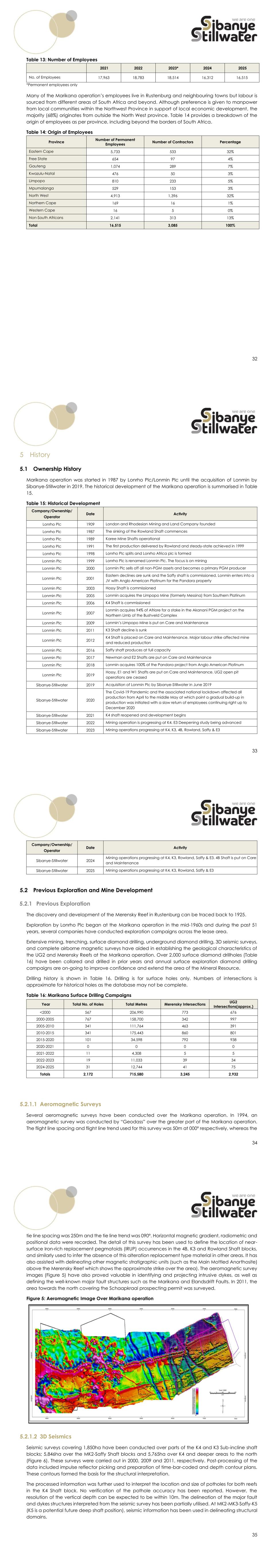 32 Table 13: Number of Employees 2021 2022 2023* 2024 2025 No. of Employees 17,963 18,783 18,514 16,312 16,515 *Permanent employees only Many of the Marikana operation’s employees live in Rustenburg and neighbouring towns but labour is sourced from different areas of South Africa and beyond. Although preference is given to manpower from local communities within the Northwest Province in support of local economic development, the majority (68%) originates from outside the North West province. Table 14 provides a breakdown of the origin of employees as per province, including beyond the borders of South Africa. Table 14: Origin of Employees Province Number of Permanent Employees Number of Contractors Percentage Eastern Cape 5,733 533 32% Free State 654 97 4% Gauteng 1,074 289 7% Kwazulu-Natal 476 50 3% Limpopo 810 233 5% Mpumalanga 529 153 3% North West 4,913 1,396 32% Northern Cape 169 16 1% Western Cape 16 5 0% Non-South Africans 2,141 313 13% Total 16,515 3,085 100% 33 5 History 5.1 Ownership History Marikana operation was started in 1987 by Lonrho Plc/Lonmin Plc until the acquisition of Lonmin by Sibanye-Stillwater in 2019. The historical development of the Marikana operation is summarised in Table 15. Table 15: Historical Development Company/Ownership/ Operator Date Activity Lonrho Plc 1909 London and Rhodesian Mining and Land Company founded Lonrho Plc 1987 The sinking of the Rowland Shaft commences Lonrho Plc 1989 Karee Mine Shafts operational Lonrho Plc 1991 The first production delivered by Rowland and steady-state achieved in 1999 Lonrho Plc 1998 Lonrho Plc splits and Lonrho Africa plc is formed Lonmin Plc 1999 Lonrho Plc is renamed Lonmin Plc. The focus is on mining Lonmin Plc 2000 Lonmin Plc sells off all non-PGM assets and becomes a primary PGM producer Lonmin Plc 2001 Eastern declines are sunk and the Saffy shaft is commissioned. Lonmin enters into a JV with Anglo American Platinum for the Pandora property Lonmin Plc 2003 Hossy Shaft is commissioned Lonmin Plc 2005 Lonmin acquires the Limpopo Mine (formerly Messina) from Southern Platinum Lonmin Plc 2006 K4 Shaft is commissioned Lonmin Plc 2007 Lonmin acquires 94% of Afriore for a stake in the Akanani PGM project on the Northern Limb of the Bushveld Complex Lonmin Plc 2009 Lonmin’s Limpopo Mine is put on Care and Maintenance Lonmin Plc 2011 K3 Shaft decline is sunk Lonmin Plc 2012 K4 Shaft is placed on Care and Maintenance. Major labour strike affected mine and reduced production Lonmin Plc 2016 Saffy shaft produces at full capacity Lonmin Plc 2017 Newman and E2 Shafts are put on Care and Maintenance Lonmin Plc 2018 Lonmin acquires 100% of the Pandora project from Anglo American Platinum Lonmin Plc 2019 Hossy, E1 and W1 Shafts are put on Care and Maintenance. UG2 open pit operations are ceased Sibanye-Stillwater 2019 Acquisition of Lonmin Plc by Sibanye-Stillwater in June 2019 Sibanye-Stillwater 2020 The Covid-19 Pandemic and the associated national lockdown affected all production from April to the middle May at which point a gradual build-up in production was initiated with a slow return of employees continuing right up to December 2020 Sibanye-Stillwater 2021 K4 shaft reopened and development begins Sibanye-Stillwater 2022 Mining operation is progressing at K4. E3 Deepening study being advanced Sibanye-Stillwater 2023 Mining operations progressing at K4, K3, 4B, Rowland, Saffy & E3 34 Company/Ownership/ Operator Date Activity Sibanye-Stillwater 2024 Mining operations progressing at K4, K3, Rowland, Saffy & E3. 4B Shaft is put on Care and Maintenance Sibanye-Stillwater 2025 Mining operations progressing at K4, K3, Rowland, Saffy & E3 5.2 Previous Exploration and Mine Development 5.2.1 Previous Exploration The discovery and development of the Merensky Reef in Rustenburg can be traced back to 1925. Exploration by Lonrho Plc began at the Marikana operation in the mid-1960s and during the past 51 years, several companies have conducted exploration campaigns across the lease area. Extensive mining, trenching, surface diamond drilling, underground diamond drilling, 3D seismic surveys, and complete airborne magnetic surveys have aided in establishing the geological characteristics of the UG2 and Merensky Reefs at the Marikana operation. Over 2,000 surface diamond drillholes (Table 16) have been collared and drilled in prior years and annual surface exploration diamond drilling campaigns are on-going to improve confidence and extend the area of the Mineral Resource. Drilling history is shown in Table 16. Drilling is for surface holes only. Numbers of intersections is approximate for historical holes as the database may not be complete. Table 16: Marikana Surface Drilling Campaigns Year Total No. of Holes Total Metres Merensky Intersections UG2 Intersections(approx.) <2000 567 206,990 773 676 2000-2005 767 158,700 342 997 2005-2010 341 111,764 463 391 2010-2015 341 175,443 860 801 2015-2020 101 34,598 792 938 2020-2021 0 0 0 0 2021-2022 11 4,308 5 5 2022-2023 19 11,033 39 34 2024-2025 31 12,744 41 75 Totals 2,172 715,580 3,245 2,932 5.2.1.1 Aeromagnetic Surveys Several aeromagnetic surveys have been conducted over the Marikana operation. In 1994, an aeromagnetic survey was conducted by “Geodass” over the greater part of the Marikana operation. The flight line spacing and flight line trend used for this survey was 50m at 000º respectively, whereas the 35 tie line spacing was 250m and the tie line trend was 090º. Horizontal magnetic gradient, radiometric and positional data were recorded. The detail of this survey has been used to define the location of near- surface Iron-rich replacement pegmatoids (IRUP) occurrences in the 4B, K3 and Rowland Shaft blocks, and similarly used to infer the absence of this alteration replacement type material in other areas. It has also assisted with delineating other magnetic stratigraphic units (such as the Main Mottled Anorthosite) above the Merensky Reef which shows the approximate strike 