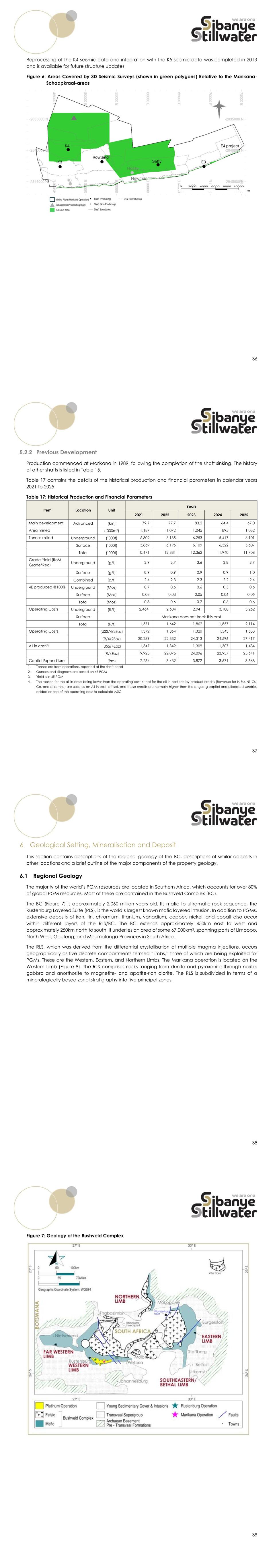 36 Reprocessing of the K4 seismic data and integration with the K5 seismic data was completed in 2013 and is available for future structure updates. Figure 6: Areas Covered by 3D Seismic Surveys (shown in green polygons) Relative to the Marikana- Schaapkraal-areas 37 5.2.2 Previous Development Production commenced at Marikana in 1989, following the completion of the shaft sinking. The history of other shafts is listed in Table 15. Table 17 contains the details of the historical production and financial parameters in calendar years 2021 to 2025. Table 17: Historical Production and Financial Parameters Item Location Unit Years 2021 2022 2023 2024 2025 Main development Advanced (km) 79.7 77.7 83.2 64.4 67.0 Area mined (’000m2) 1,187 1,072 1,045 895 1,032 Tonnes milled Underground (’000t) 6,802 6,135 6,253 5,417 6,101 Surface (’000t) 3,869 6,196 6,109 6,522 5,607 Total (’000t) 10,671 12,331 12,362 11,940 11,708 Grade-Yield (RoM Grade*Rec) Underground (g/t) 3.9 3.7 3.6 3.8 3.7 Surface (g/t) 0.9 0.9 0.9 0.9 1.0 Combined (g/t) 2.4 2.3 2.3 2.2 2.4 4E produced @100% Underground (Moz) 0.7 0.6 0.6 0.5 0.6 Surface (Moz) 0.03 0.03 0.05 0.06 0.05 Total (Moz) 0.8 0.6 0.7 0.6 0.6 Operating Costs Underground (R/t) 2,464 2,604 2,941 3,108 3,262 Surface Marikana does not track this cost Total (R/t) 1,571 1,642 1,862 1,857 2,114 Operating Costs (US$/4/2Eoz) 1,372 1,364 1,320 1,343 1,533 (R/4/2Eoz) 20,289 22,332 24,313 24,596 27,417 All in cost(7) (US$/4Eoz) 1,347 1,349 1,309 1,307 1,434 (R/4Eoz) 19,925 22,076 24,096 23,937 25,641 Capital Expenditure (Rm) 2,254 3,432 3,872 3,571 3,568 1. Tonnes are from operations, reported at the shaft head 2. Ounces and kilograms are based on 4E PGM 3. Yield is in 4E PGM 4. The reason for the all-in-costs being lower than the operating cost is that for the all-in-cost the by-product credits (Revenue for Ir, Ru, Ni, Cu, Co, and chromite) are used as an All-in-cost off-set, and these credits are normally higher than the ongoing capital and allocated sundries added on top of the operating cost to calculate ASIC 38 6 Geological Setting, Mineralisation and Deposit This section contains descriptions of the regional geology of the BC, descriptions of similar deposits in other locations and a brief outline of the major components of the property geology. 6.1 Regional Geology The majority of the world’s PGM resources are located in Southern Africa, which accounts for over 80% of global PGM resources. Most of these are contained in the Bushveld Complex (BC). The BC (Figure 7) is approximately 2,060 million years old. Its mafic to ultramafic rock sequence, the Rustenburg Layered Suite (RLS), is the world’s largest known mafic layered intrusion. In addition to PGMs, extensive deposits of iron, tin, chromium, titanium, vanadium, copper, nickel, and cobalt also occur within different layers of the RLS/BC. The BC extends approximately 450km east to west and approximately 250km north to south. It underlies an area of some 67,000km2, spanning parts of Limpopo, North West, Gauteng, and Mpumalanga Provinces in South Africa. The RLS, which was derived from the differential crystallisation of multiple magma injections, occurs geographically as five discrete compartments termed “limbs,” three of which are being exploited for PGMs. These are the Western, Eastern, and Northern Limbs. The Marikana operation is located on the Western Limb (Figure 8). The RLS comprises rocks ranging from dunite and pyroxenite through norite, gabbro and anorthosite to magnetite- and apatite-rich diorite. The RLS is subdivided in terms of a mineralogically based zonal stratigraphy into five principal zones. 39 Figure 7: Geology of the Bushveld Complex